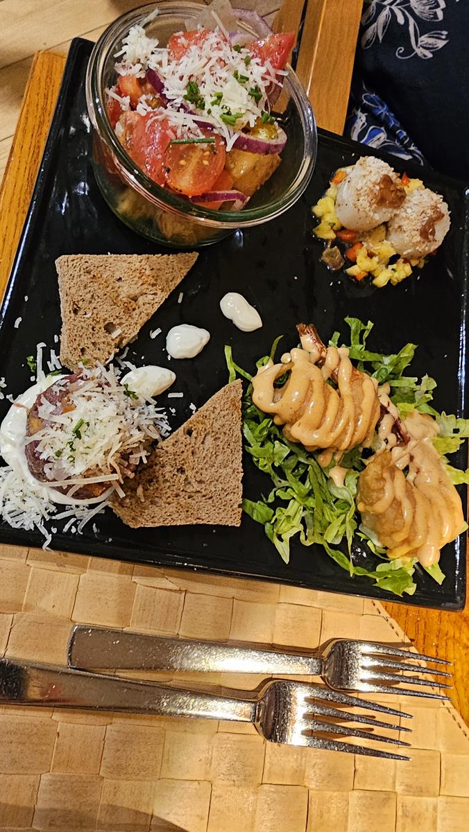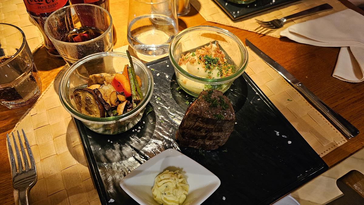 Wir entscheiden uns für die Vorspeisenplatte für Zwei mit Jakobsmuscheln, Spicy Shrimps, Tomaten Brotsalat und Beef Tartar. Und anschließend für das Rinderfilet mit Kräuterbutter. Astrid wählt als Beilage den Kartoffelstampf und Grillgemüse und ich die Süßkartoffel-Pommes und Champignons. Ein Dessert passt da leider nicht mehr rein 😉