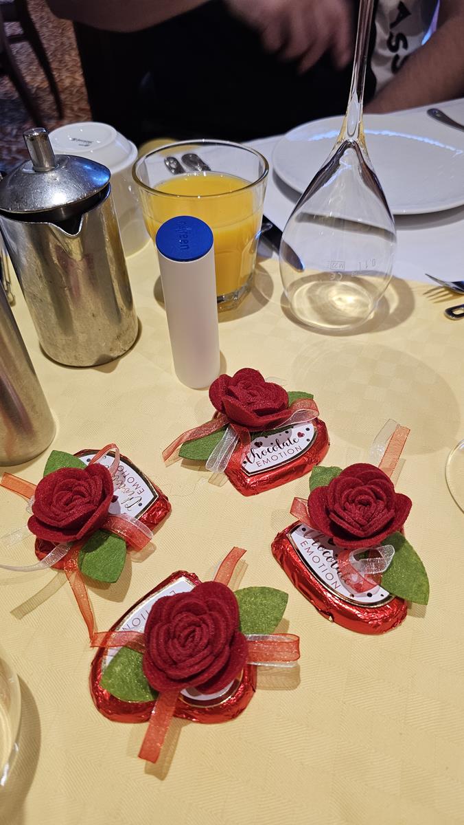 Wir starten mit einem guten Frühstück im Weite Welt Restaurant. Torsten hat das Frühstück vorab über myAida reserviert. Uns erwartet ein sehr schön gedeckter Tisch und eine Flasche Sekt. Passend dazu: Rosen zum Valentinstag 🙂 Das Frühstück holen wir uns ganz normal am Buffett.