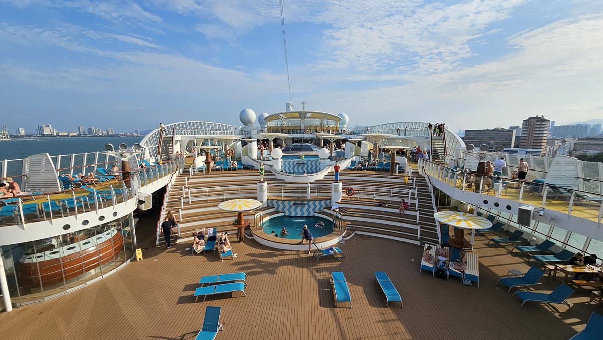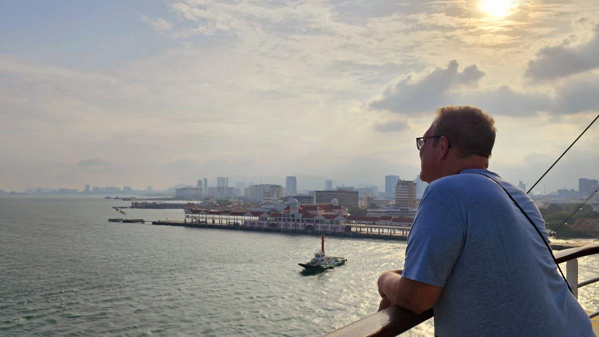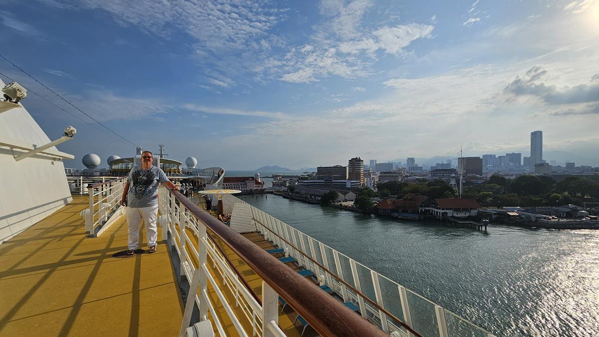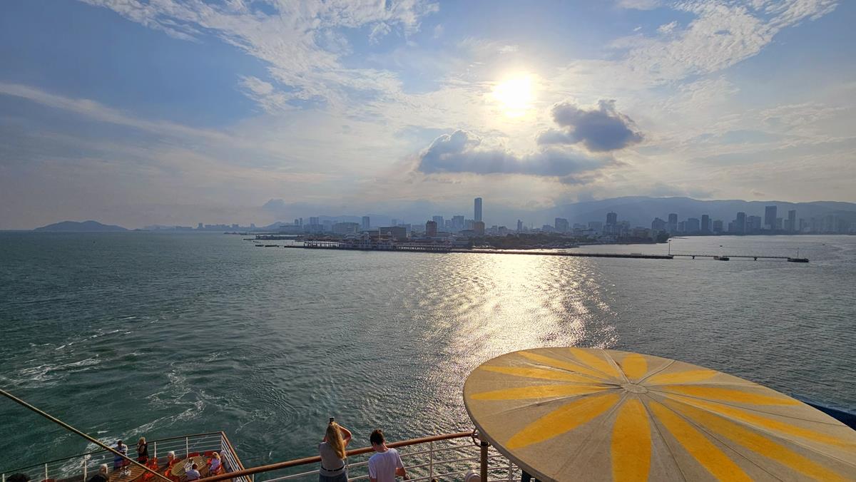 Viel passiert heute nicht mehr. Die Hitze und die sehr hohe Luftfeuchtigkeit tun ein übriges. Pünktlich um 18 Uhr legen wir ab und verlassen Penang. Wir beobachten das Ablegemanöver von Deck 12 aus und sehen Penang ganz langsam am Horizont verschwinden. Mit dem Fahrtwind kommt ein laues Lüftchen auf, das tut so gut.