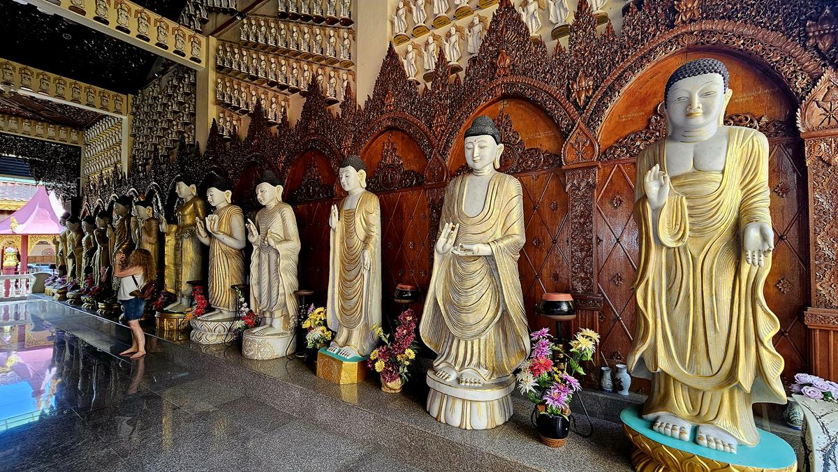 Im hinteren Teil des Schreins stehen die sogenannten International Standing Buddhas mit Buddha-Statuen im Stil unterschiedlicher Länder. Keine der Statuen sieht aus wie die andere.