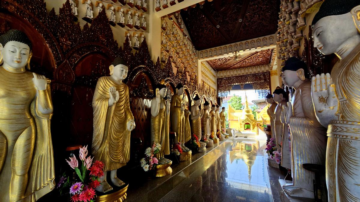 Die Sima Shrine Hall ist mit traumhaften Teakholzschnitzereien verziert. Hier befindet sich eine mächtige, 8,2 Meter hohe Buddha Statue aus weißem myanmarischem Marmor. Wahnsinn! Total beeindruckend!