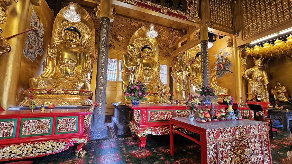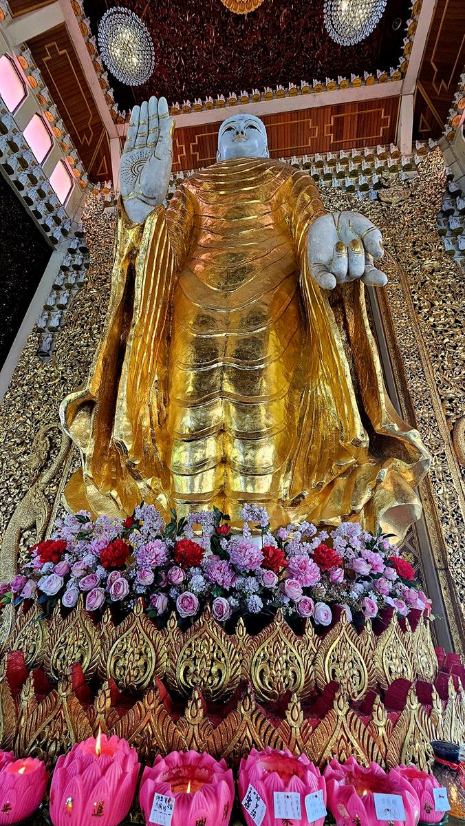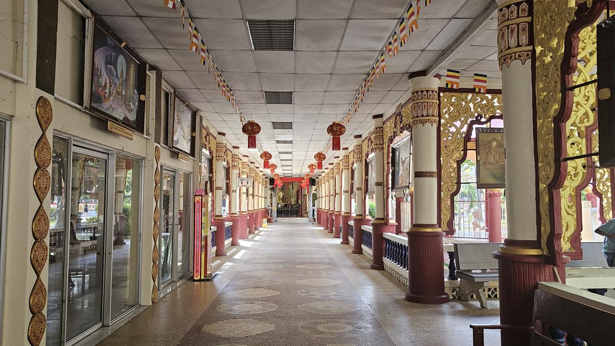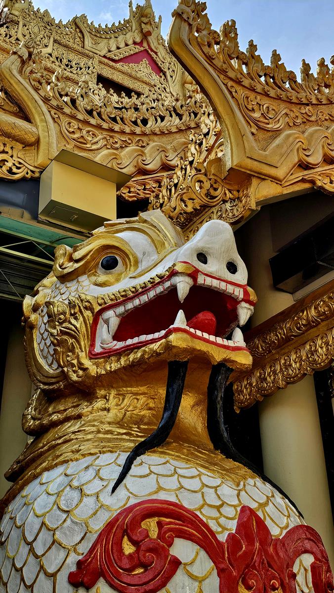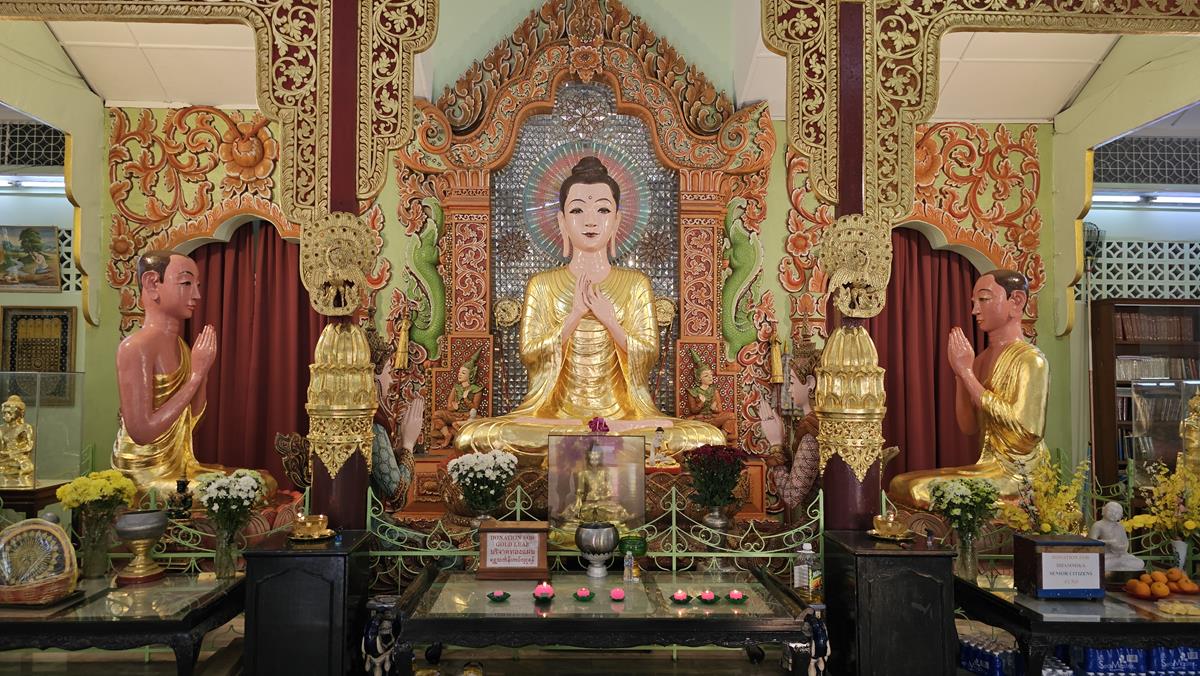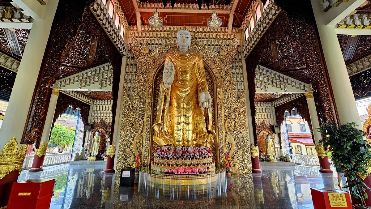 Wir schreiten durch das goldverzierte Tor. Vor uns liegt eine viel größere Tempelanlage als erwartet. Der burmesische Tempel bietet neben den Gebetshallen und dem Tempelkomplex auch eine schöne Gartenanlage und sogar mehrere Koiteiche. Auf dem gesamten Gelände überwiegt die Farbe Gold, es gibt aufwändige Holzschnitzereien und farbenfrohe Wandgemälde.