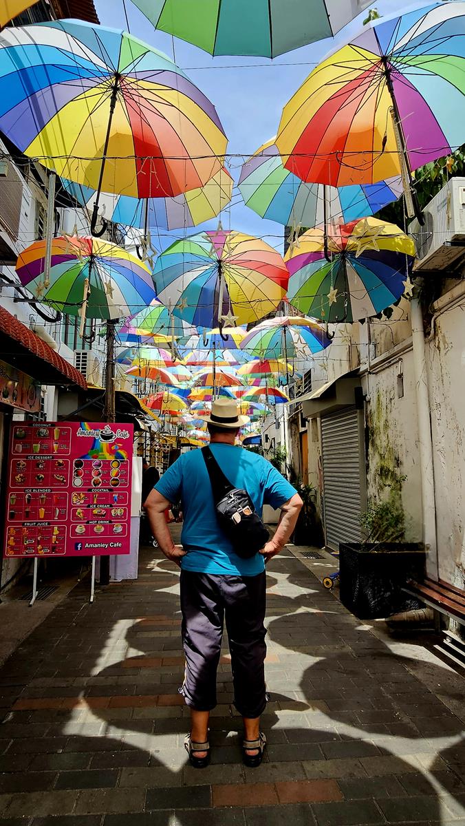Eine kleine Querstraße zur Armenian Street leuchtet schon von weitem: In bunten Regenbogenfarben hängen unzählige Regenschirme als Sonnenschutz zwischen den Häusern. Nicht umsonst wird die kleine und schmale Gasse „Umbrella Street“ genannt 🙂