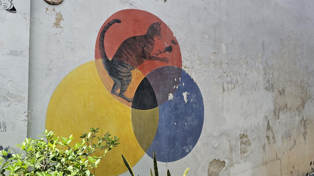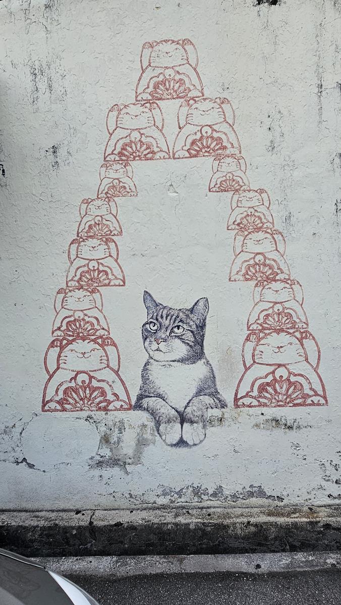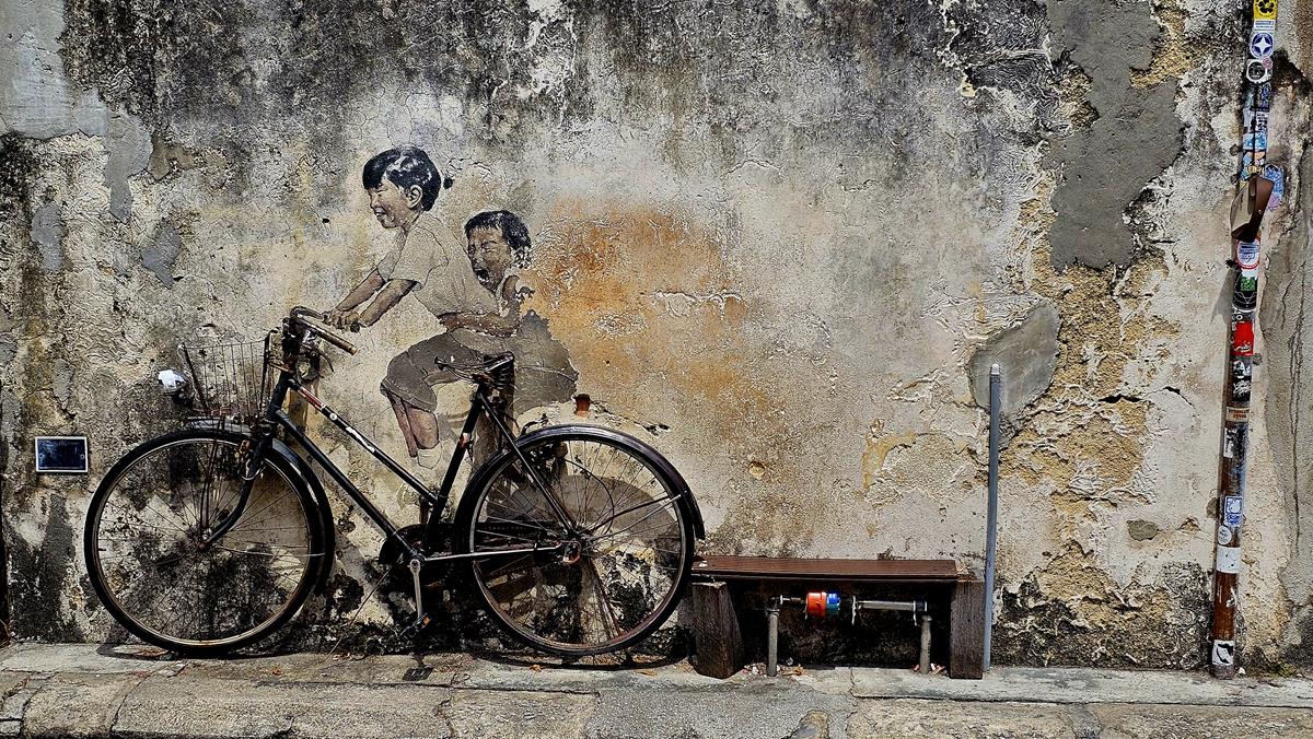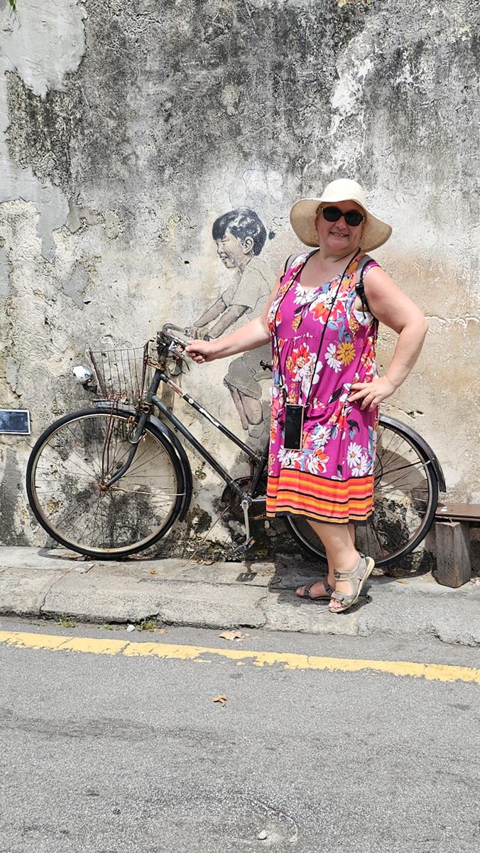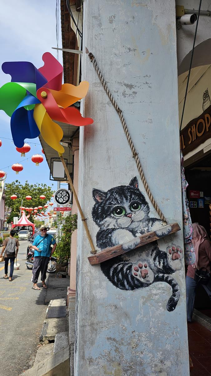 Wir schlendern die Armenian Street hoch. Überall finden wir viele bunte Wandgemälde und Streetart, darunter Werke des Künstlers Ernest Zacharevic. Dieser Künstler malt „3D-Bilder“ indem er Gemälde mit echten Gegenständen wie z.B. einem Fahrrad verbindet. Eine echt coole Idee!