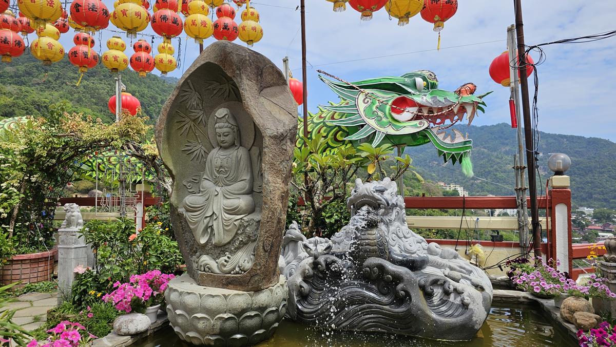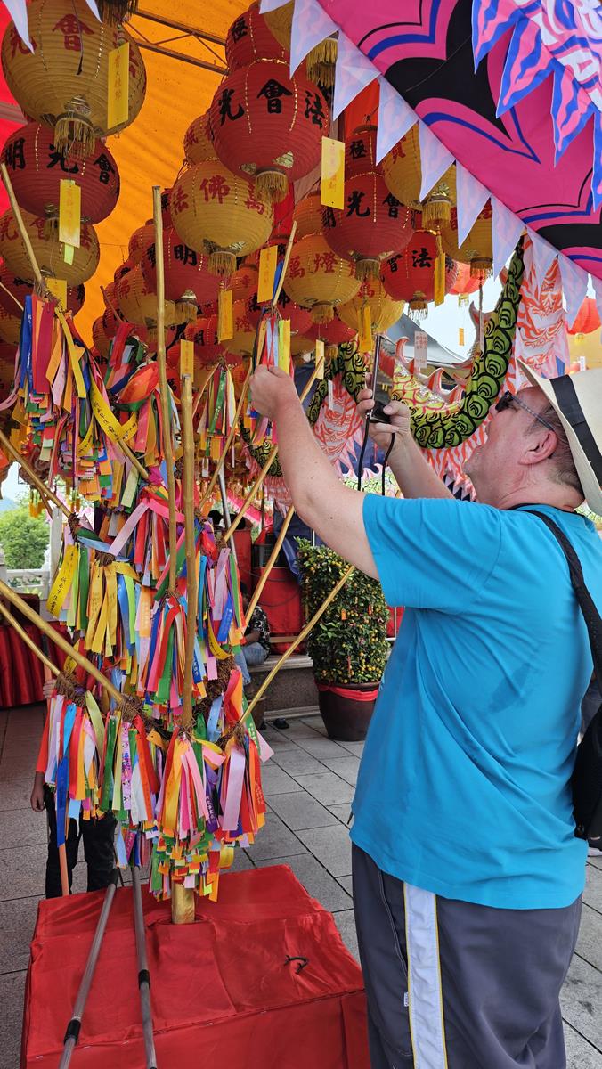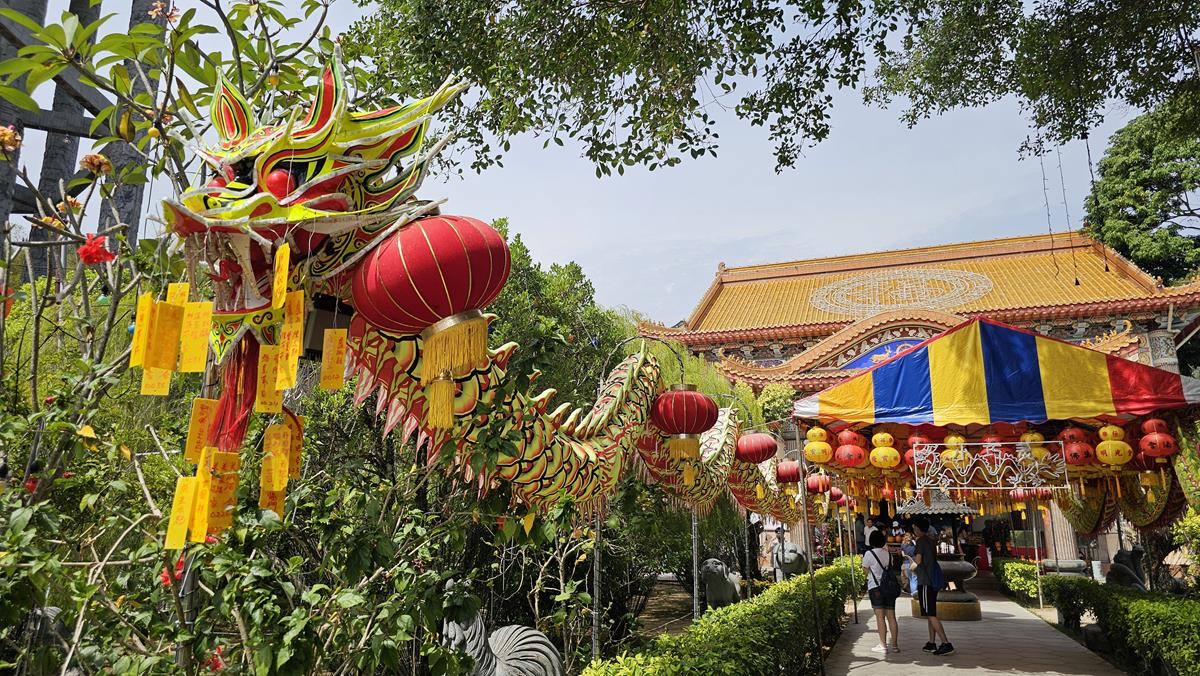 Der Tempel ist mit tausenden von farbenfrohen hängenden Laternen geschmückt. Vor 14 Tagen war das chinesische Neujahrsfest, das Jahr des Drachen. Deshalb sind auch noch überall Drachen als Deko zu sehen.