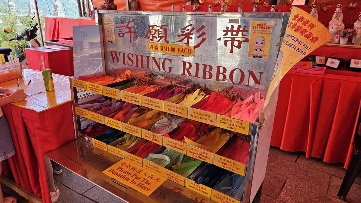 In einem kleinen Tempel können wir mit bunten Wishing Ribbons einen Wunsch an die Götter richten. Jedes der Wunschbänder hat eine andere Farbe und ist mit einem anderen Wunsch bedruckt. Nach einer kleinen Spende wählen wir unsere Ribbons aus, schreiben unsere Namen und das Datum auf das Band und hängen sie an den Wunschbaum zu vielen anderen Wunsch-Ribbons.