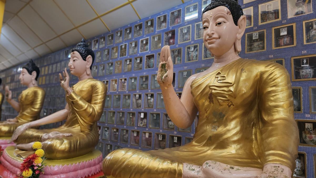 Vor dem liegenden Buddha gibt es eine Menge Gebetsschreine für die Besucher. Auf der Rückseite befinden sich Urnengräber, in denen sich neben den Urnen auch weltliche Kleinigkeiten für die Verstorbenen befinden, die von den Angehörigen dort hineingelegt wurden.