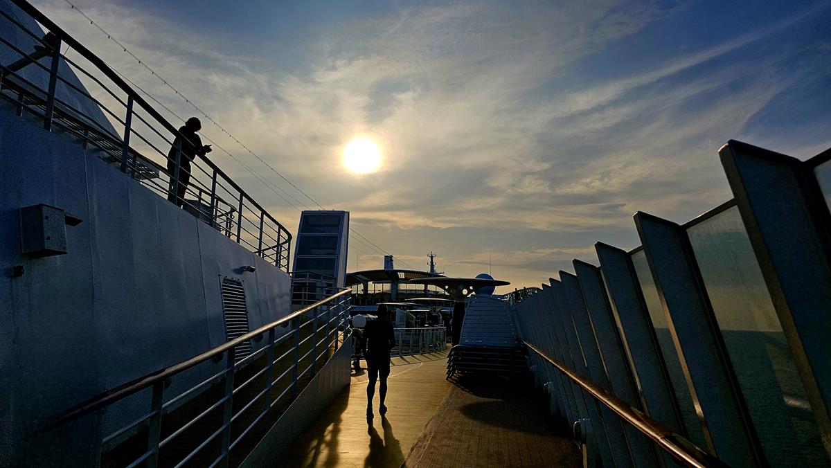 Geschafft, aber glücklich machen wir uns auf den Weg zum Schiff. Pünktlich um 18 Uhr legen wir ab. Wir beobachten das Ablegemanöver von Deck aus und genießen die letzten Sonnenstrahlen.