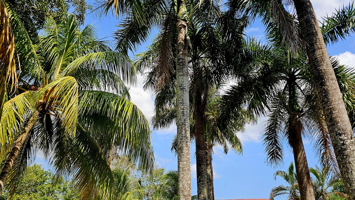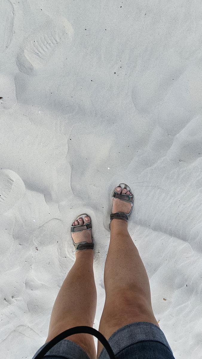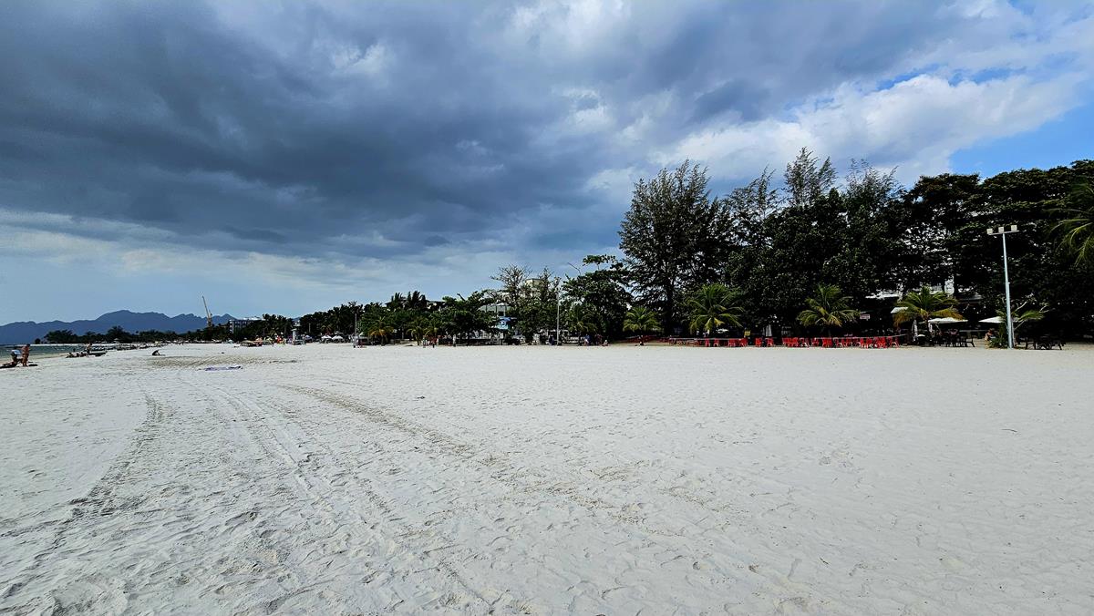 Der Sand ist herrlich weich und weiß wie Puderzucker. Gesäumt wird der Strand von einer Reihe an Palmen und einheimischen Bäumen. Es ist heute nicht viel los hier, nur vereinzelt genießen Menschen diesen schönen Strand. Am Horizont ziehen dunkle Wolken auf, über den Bergen könnte es sogar regnen.