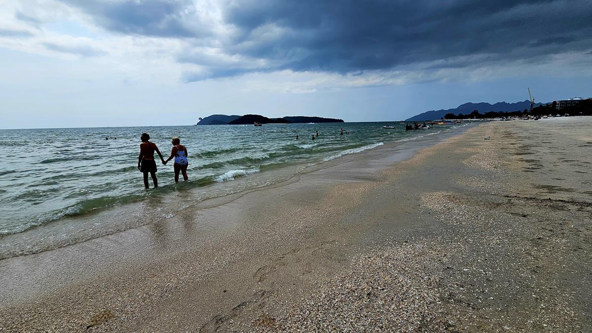 Geflasht von den Eindrücken fahren wir wieder in Richtung Schiff. Doch vorher halten wir nach rund 45 Minuten Fahrt an unserem letzten Stopp für diesen Tag: Cenang Beach. Hier haben wir eine knappe Stunde Aufenthalt. Man hat zwei Möglichkeiten: Auf der Hauptstraße Cenang Walk oder in der nahen Mall nach Herzenslust shoppen gehen oder für einen Aufenthalt am nahen Strand. Wir entscheiden uns für den Strand 🙂