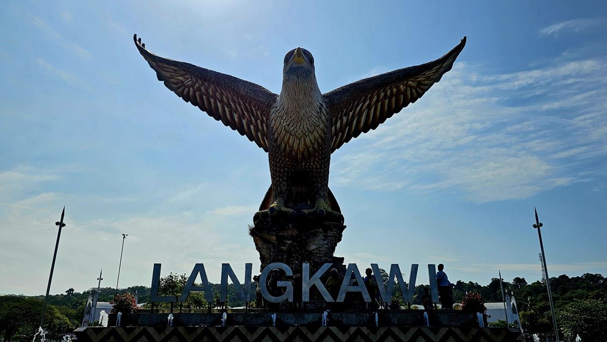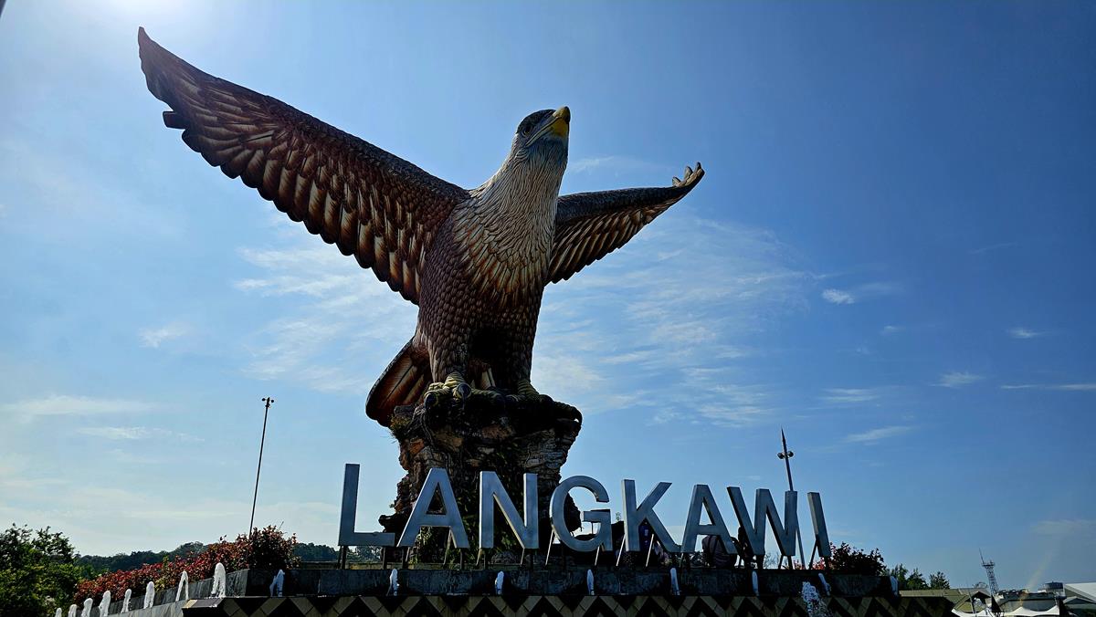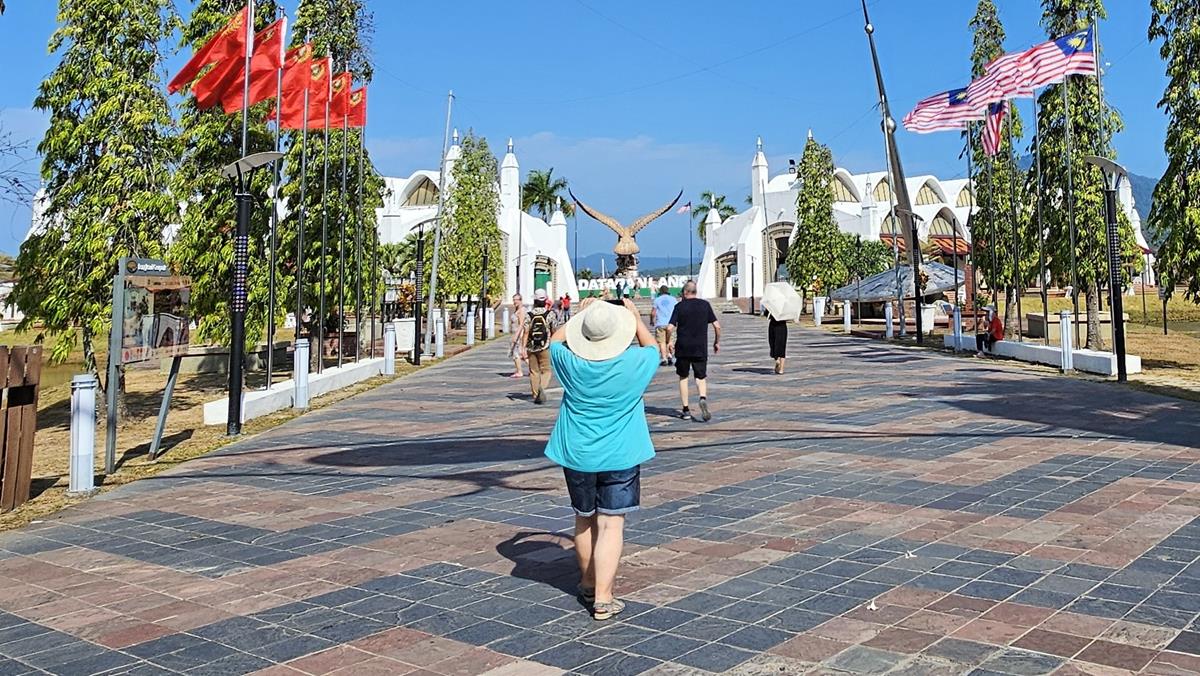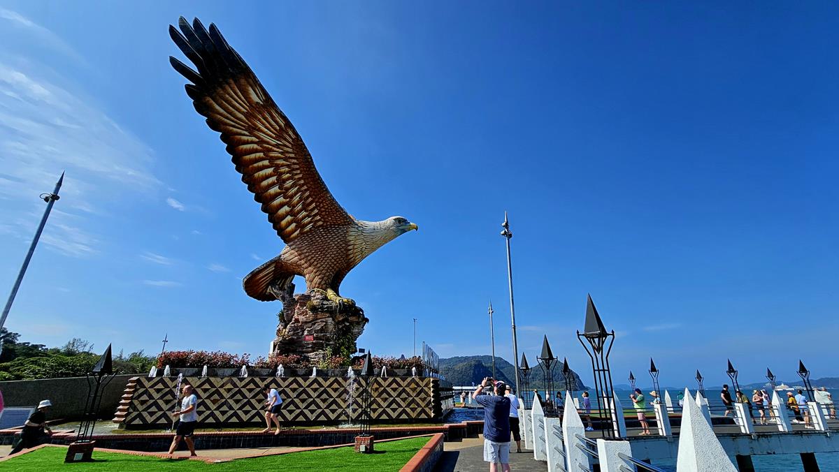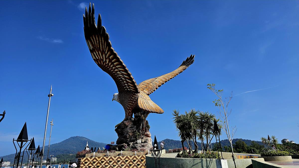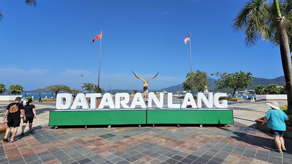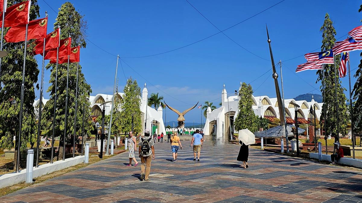 Alle haben im Bus einen Platz gefunden. Es kann losgehen zum ersten Stopp: Eagle Square oder Dataran Lang liegt ungefähr 40 Busminuten entfernt in der Hauptstadt Kuah, was übersetzt „Sauce“ bedeutet. Das Highlight hier am großzügig angelegten Eagle Square ist die gewaltige, über 12 Meter hohe Statue eines Weißkopf-Seeadlers: Dem Wappentier Langkawis.