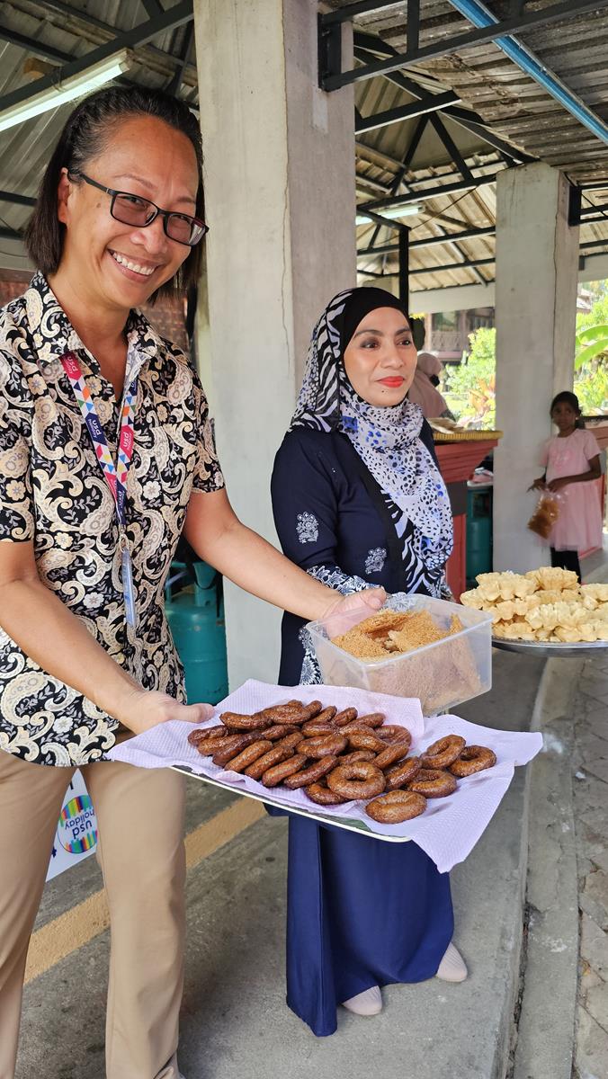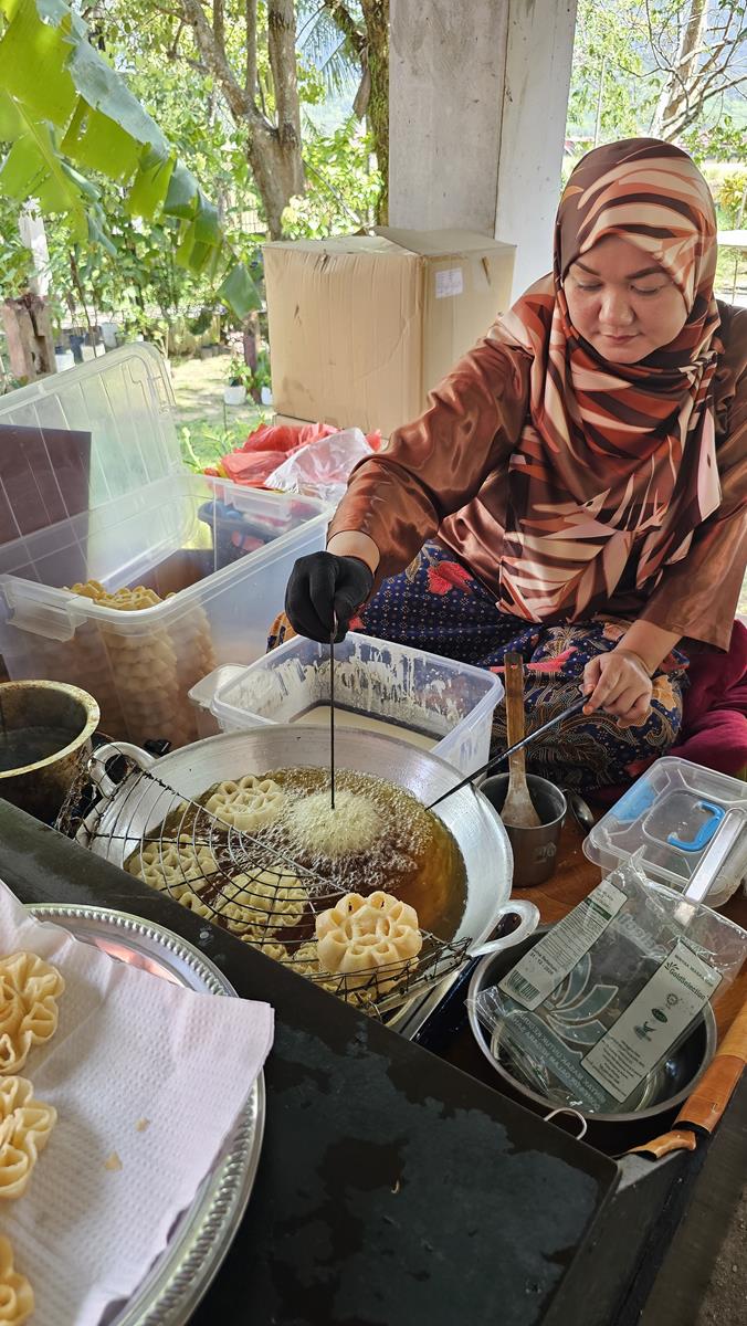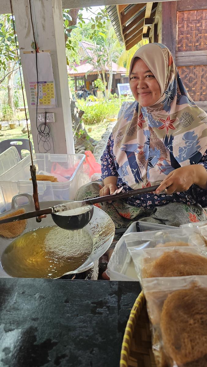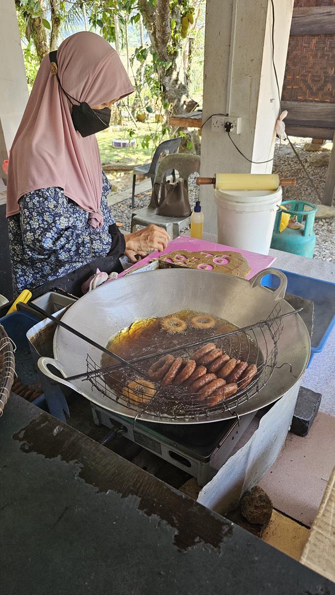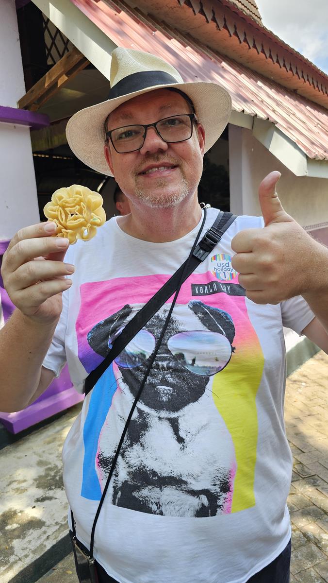 Nikki führt uns zu einem freistehenden offenen Haus mit mehreren Kochstellen. Wir werden schon erwartet. Und es wird uns etwas ganz Besonderes serviert: Typisch malaysische Süßigkeiten! Frisch hergestellt von einheimischen Frauen. Wir probieren uns durch die verschiedenen Leckereien, alles echt lecker! Ungewöhnlich, frittiert, ziemlich zuckerhaltig, aber lecker 🙂