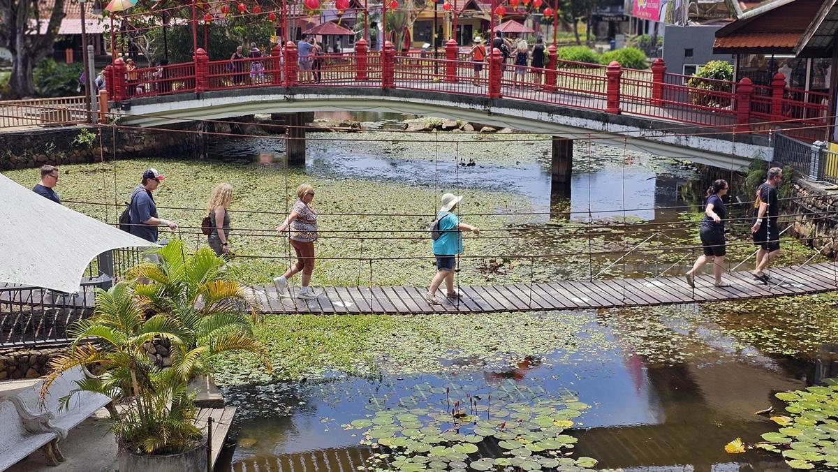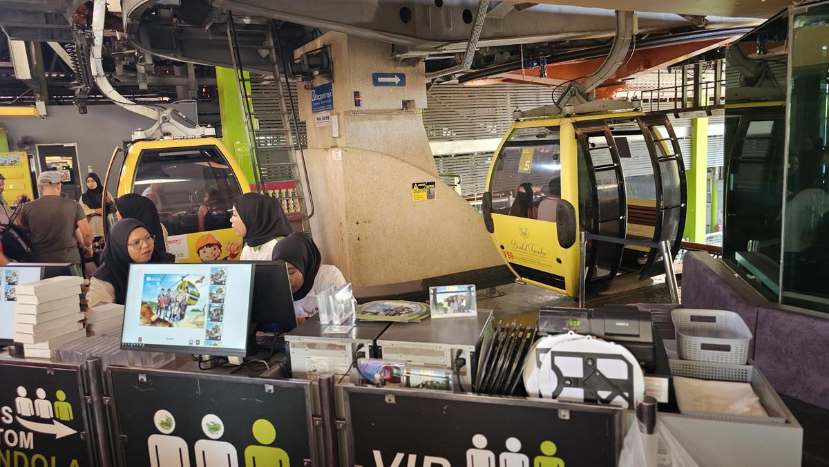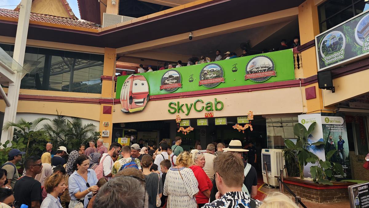 Wir parken auf dem Parkplatz des Oriental Village. Dieser hübsch arrangierte Gebäudekomplex befindet sich am Fuße des Berges und ist die Heimat der Langkawi Cable Car – der SkyCab. Die Talstation dieser SkyCab ist unser Ziel. Wir spazieren dafür durch Oriental Village, vorbei an Souvenirläden und Einzelhandelsgeschäften, Galerien, Fahrgeschäfte, Hotels und sogar über eine Brücke eines riesigen Sees.