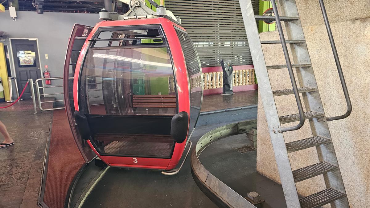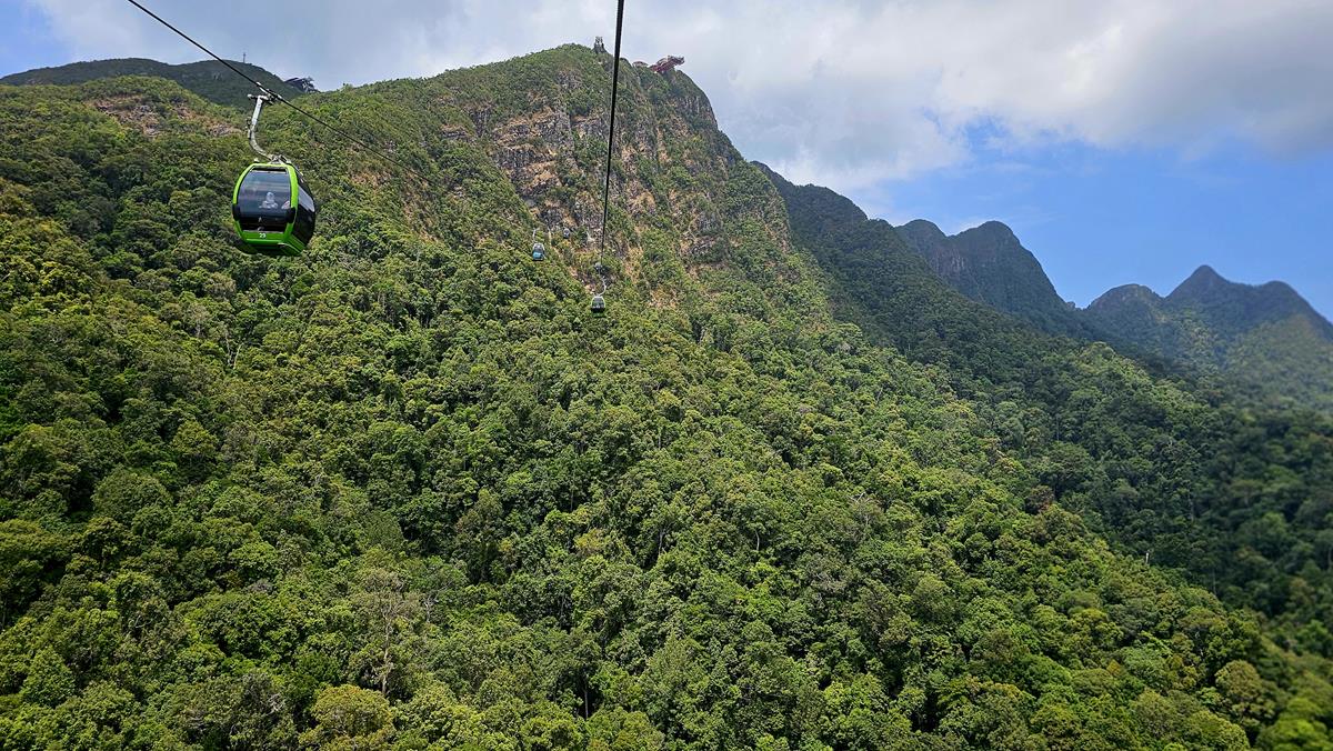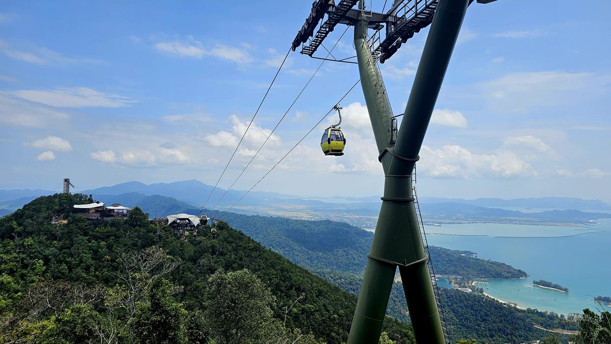 Die Gondelbahn ist eine der Hauptattraktionen von Langkawi. Es handelt sich dabei um eine der steilsten Eindraht-Seilbahnen der Welt. Die Hangneigung beträgt satte 420 Grad. Und mit dieser Seilbahn fahren wir jetzt. Die Strecke, die wir nun mit der Seilbahn zurücklegen, beträgt 919,5 Meter – also fast einen Kilometer! Es geht hinauf auf Langkawis zweithöchsten Berg, den Mount Machinchang oder, wie es hier heißt, den Gunung Machinchang. Der Gipfel liegt 708 Meter über dem Meeresspiegel.