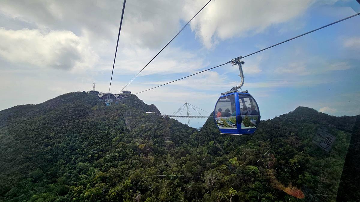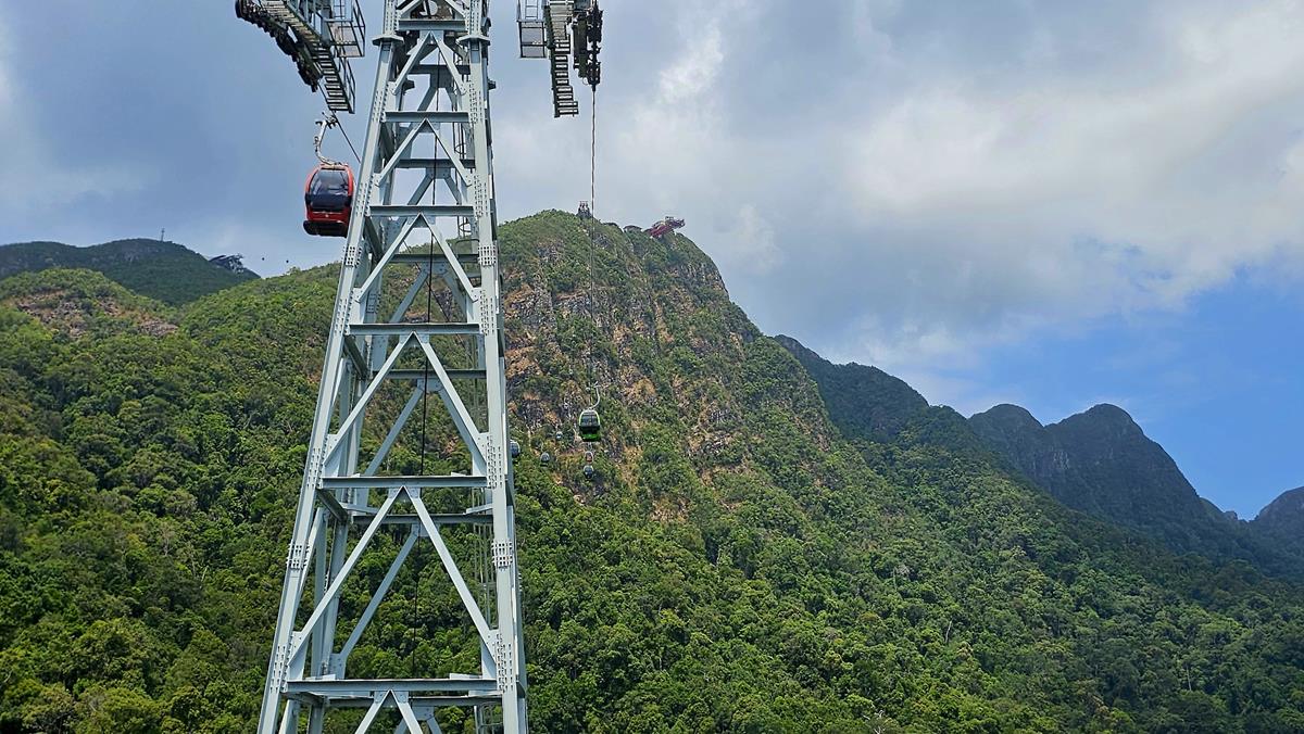Wir sind jetzt nur noch wenige Busminuten von unserem heutigen Highlight entfernt: Die Fahrt mit der Seilbahn SkyCab hoch zur freischwebenden Skyview Bridge von Langkawi.