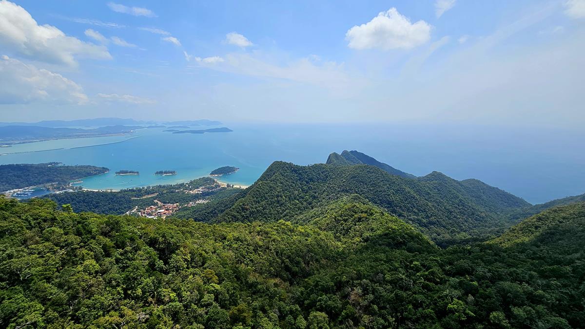 Immer wieder genießen wir den spektakulären 360-Grad-Rundumblick. Und am Ende der Brücke gibt es eine kleine Aussichtsplattform. Von hier haben wir einen fantastischen Panoramablick über den dichten, grünen Dschungel und über die Berge von Langkawi. Super tolle Aussicht!