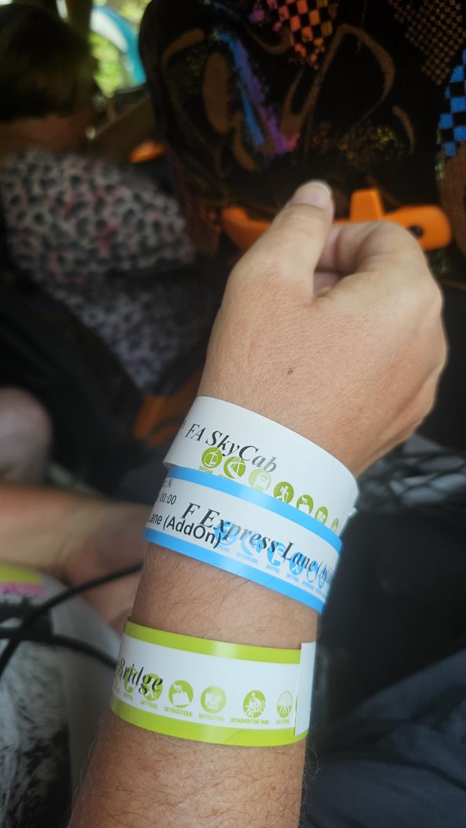 Die Tickets für die SkyCab und die Skyview Bridge wurden im Vorfeld von USD Holidays besorgt. Wir haben zusätzlich noch die Express Lane gebucht so das sich unsere Wartezeit an der Seilbahn hoffentlich in Grenzen hält. Dafür erhalten wir drei Armbändchen: Für SkyCab, für die Fastlane und für die Bridge. Ein wenig überdimensioniert, aber was soll’s 😉