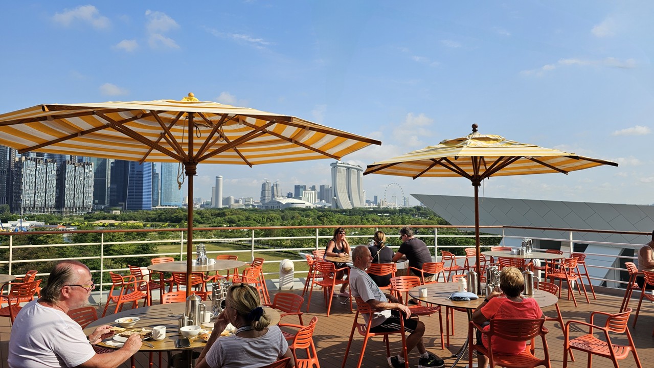 Aus diesem Grund haben wir uns mit unseren Freunden Ela und Torsten erst für viertel vor zehn verabredet. Da bleibt genügend Zeit für ein gemütliches Frühstück auf der Außenterrasse des Weite Welt Restaurant mit herrlichem Blick auf die Skyline von Singapur.