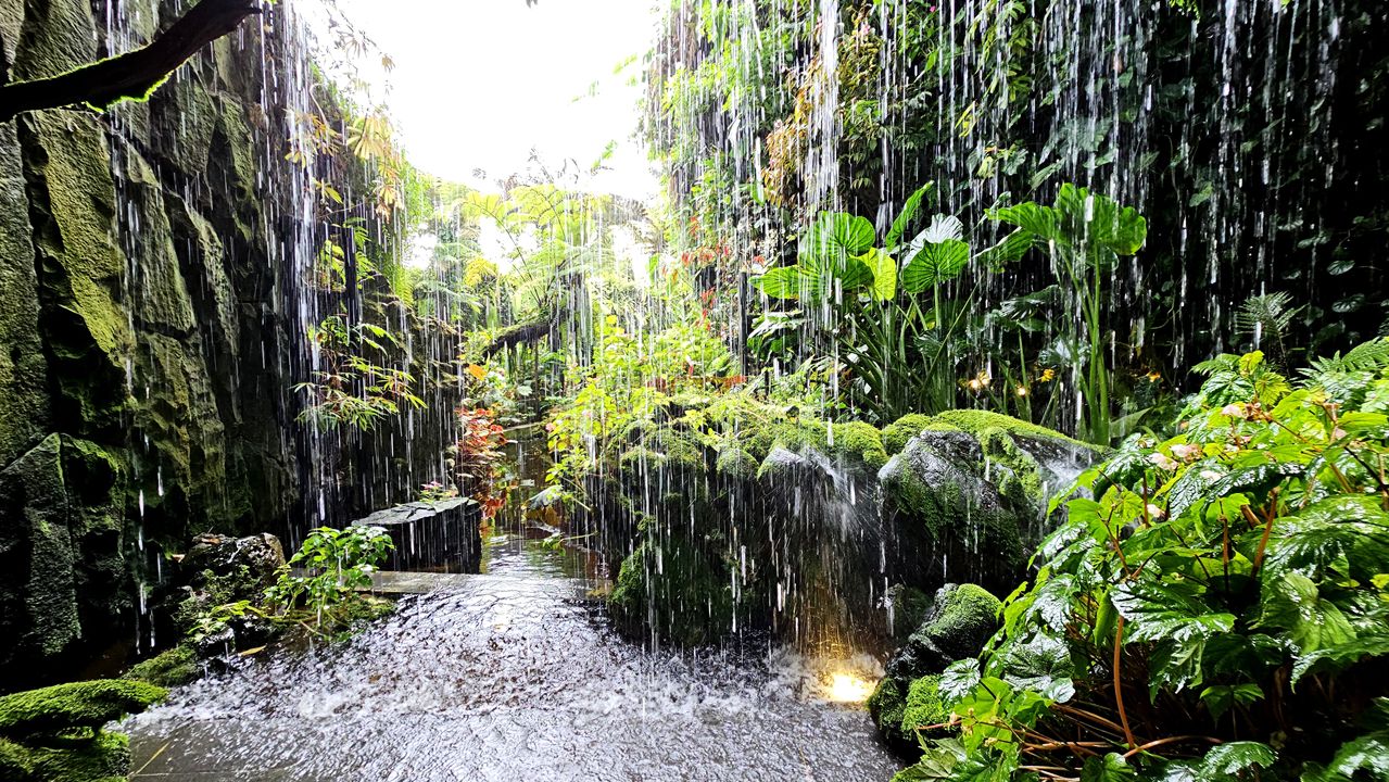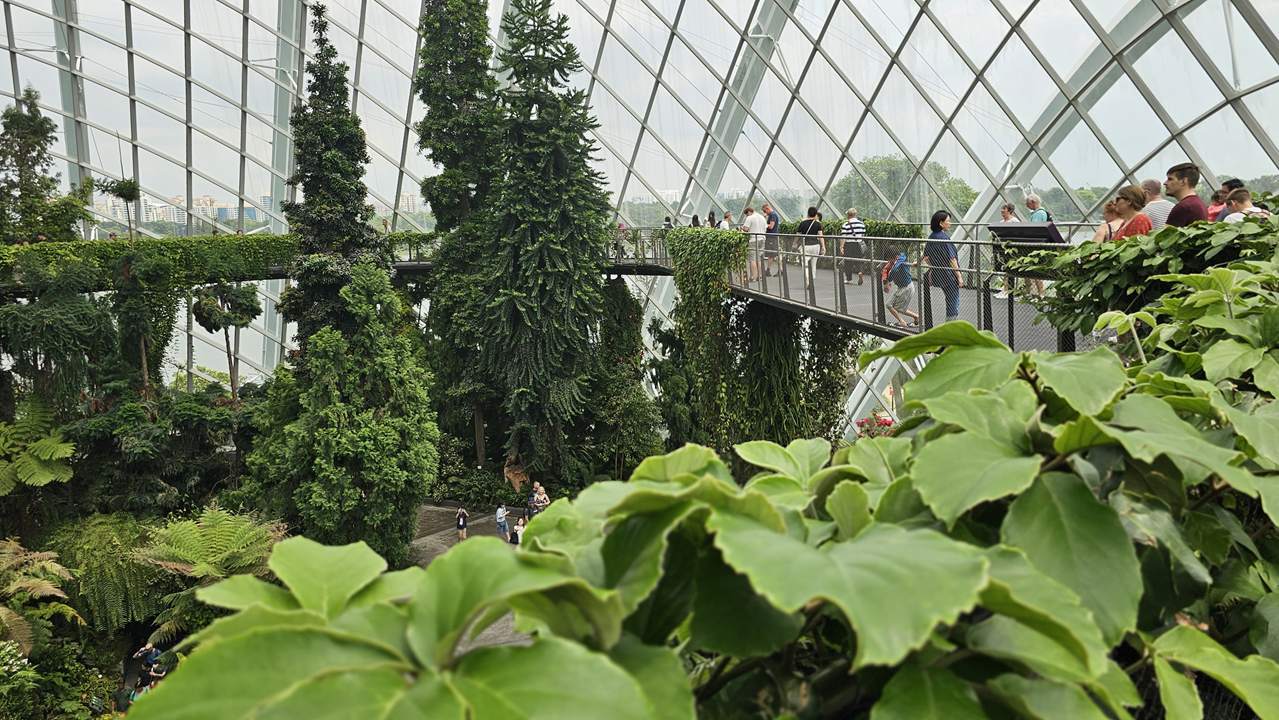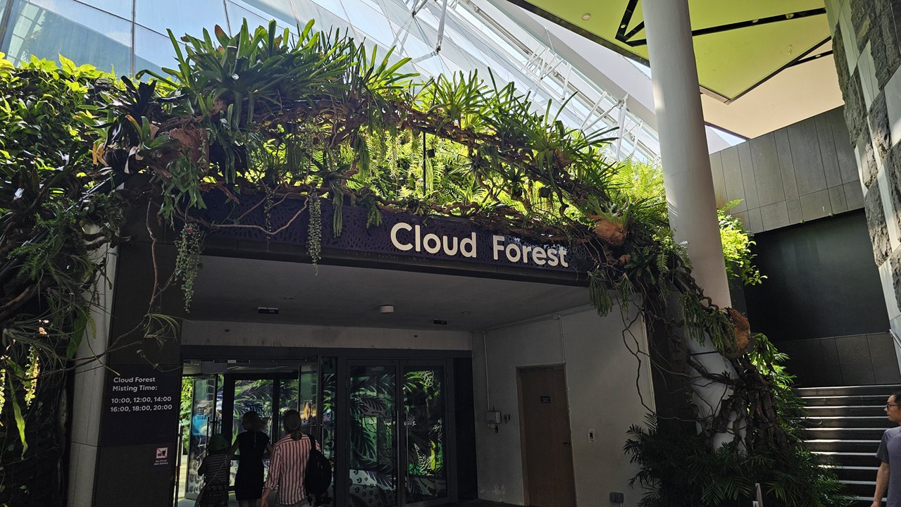Hier im Cloud Forest wird auf rund 0,8 Hektar die Vegetationszone der Tropen in Höhen von ca. 1.000 bis 3.000 Metern über Meereshöhe nachgestellt. In der Mitte steht ein 35 Meter hoher Berg, der mit für diese Region typischen Flora wie Orchideen, Bromelien oder Flamingoblumen bedeckt ist.