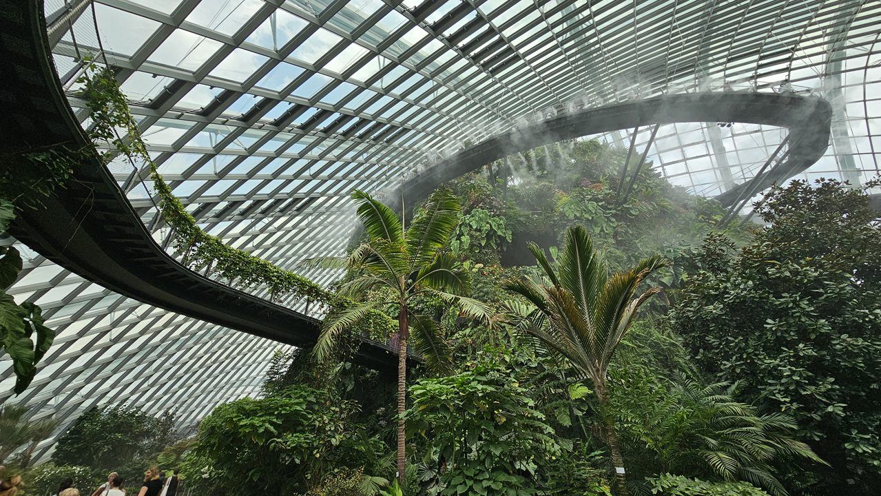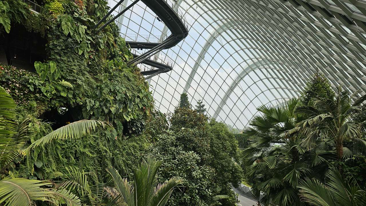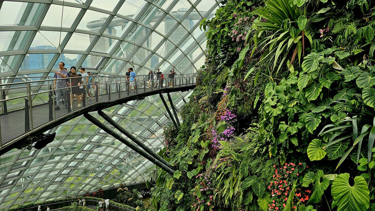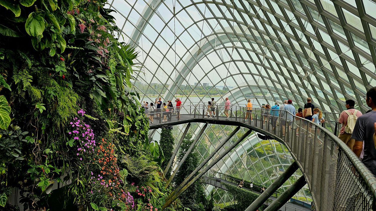 Vom Gipfel des Berges machen wir uns auf den Weg nach unten, vorbei an der ungewöhnlichen Vegetation der Nebelwälder, die typischerweise in einer Höhe von etwa 2.000 Metern über dem Meeresspiegel zu finden sind. Wir entdecken fleischfressende Pflanzen und Venusfliegenfallen, dahinter ein grüner Teppich aus zarten Farnen und Moosen. Und gleichzeitig genießen wir immer wieder durch das Glaskuppeldach die spektakuläre Aussicht auf die Marina Bay Waterfront.
