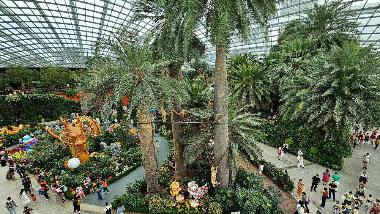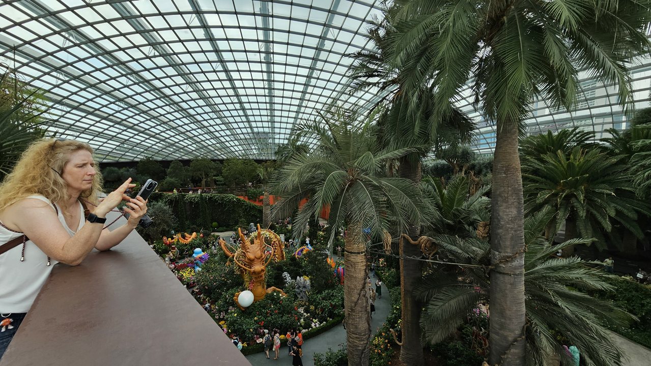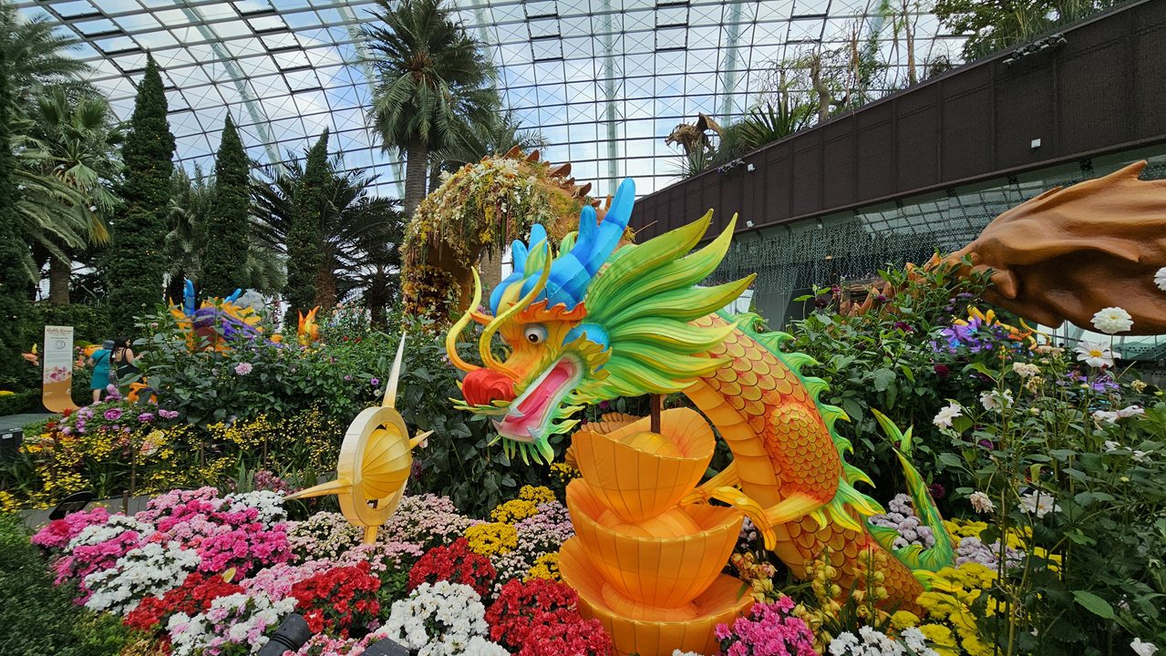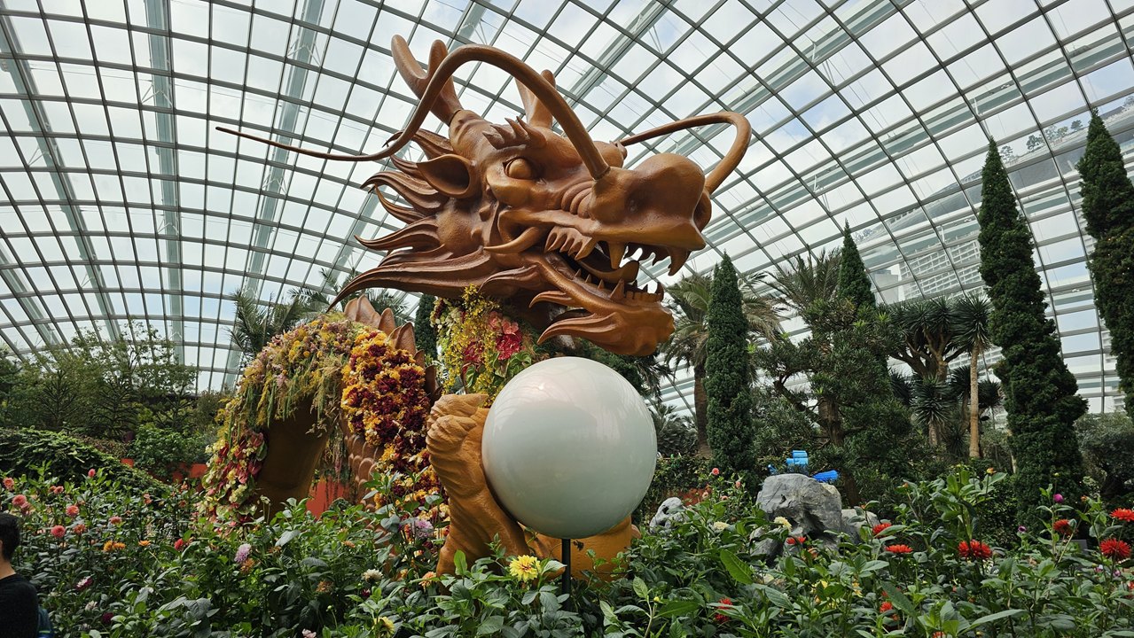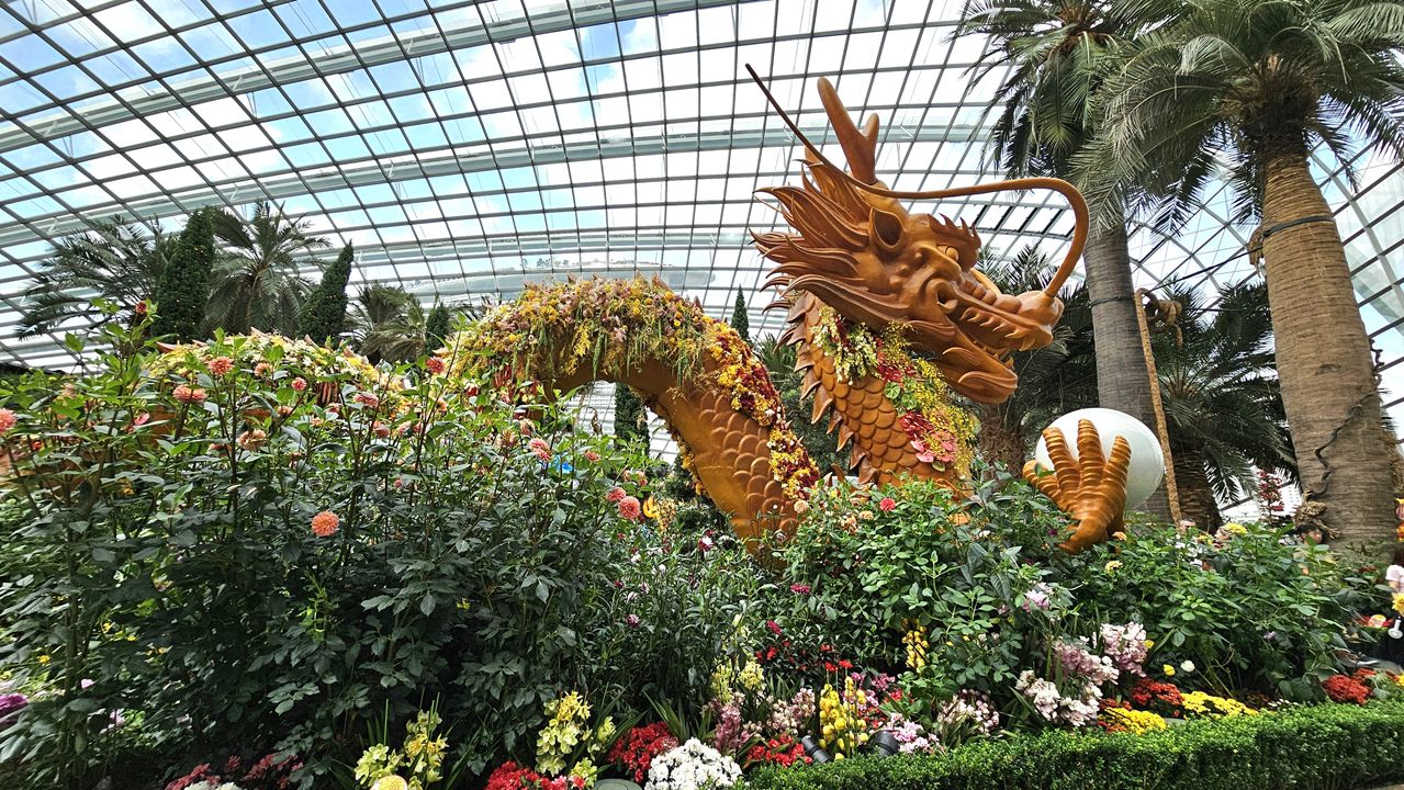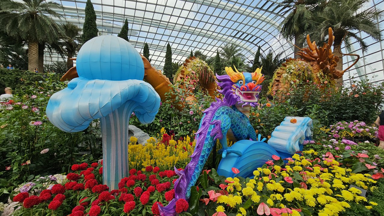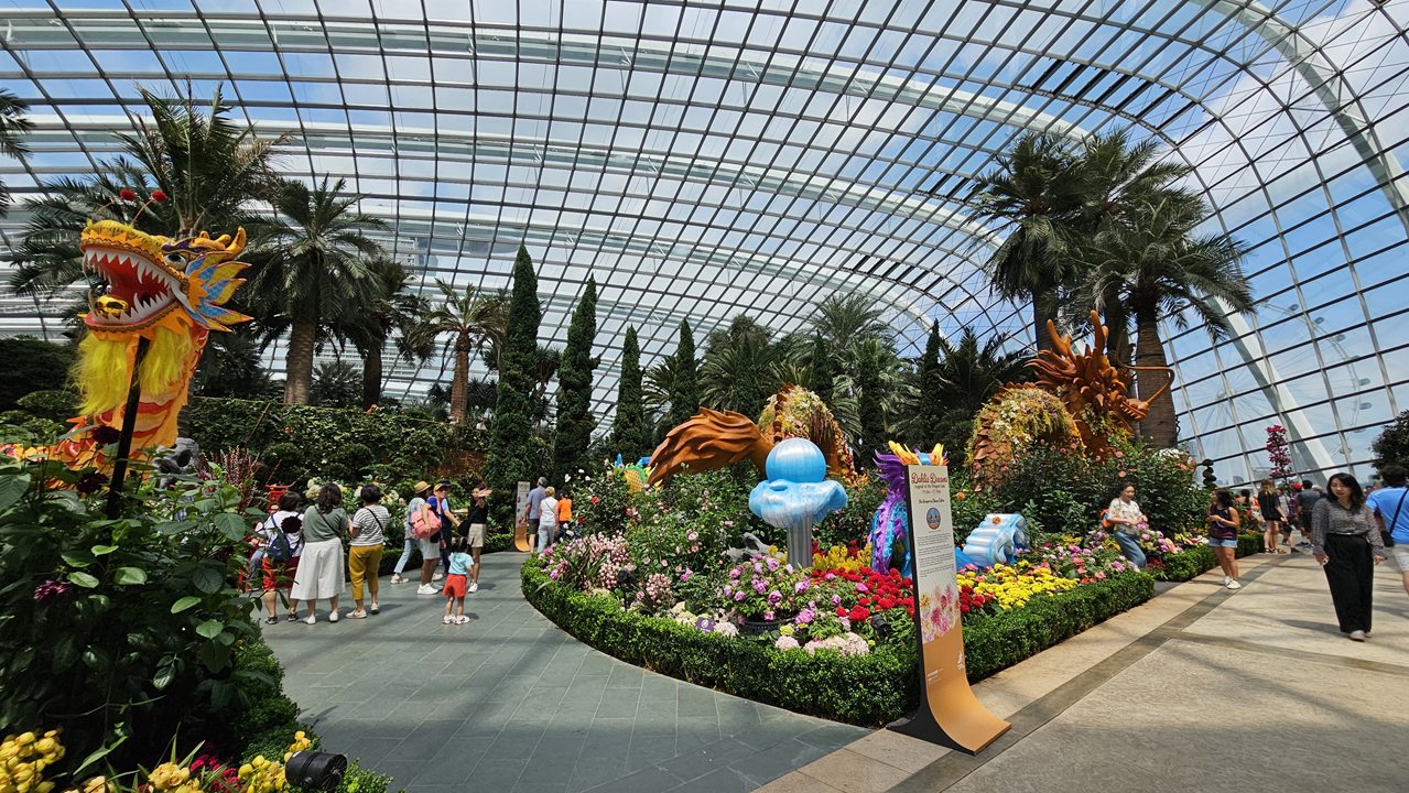 Die Blumen- und Pflanzenschau sowie die Dekoration wird einmal pro Quartal – je nach Jahreszeit – verändert. Daher sieht der Flower Dome immer etwas anders aus. Aktuell gibt es eine Sonderausstellung mit farbenprächtigen Dahlien: Dahlia Dreams 🌺. Und zusätzlich sind noch kunstvolle Drachen integriert, als Besonderheit zum chinesischen Neujahr des Drachen, das dieses Jahr zelebriert wurde.