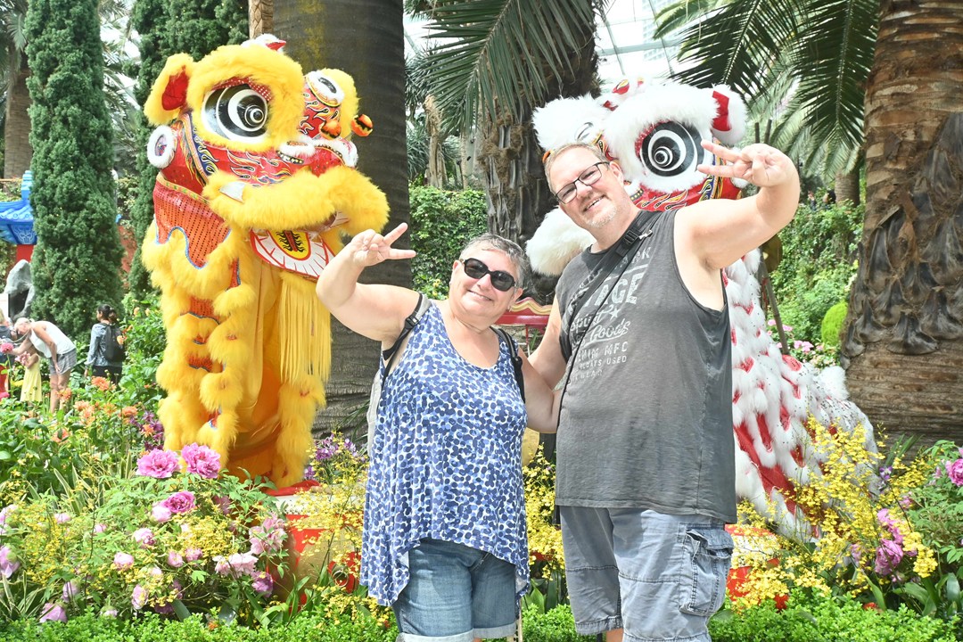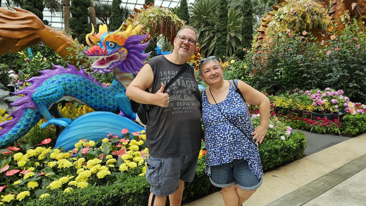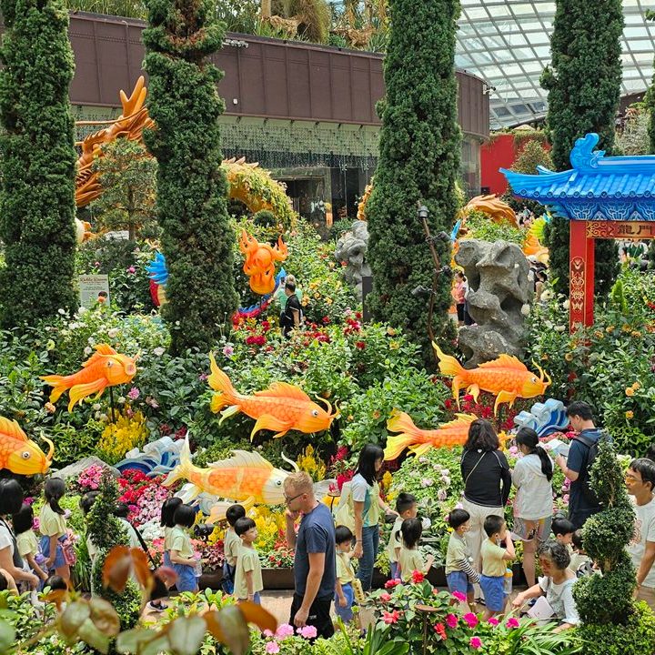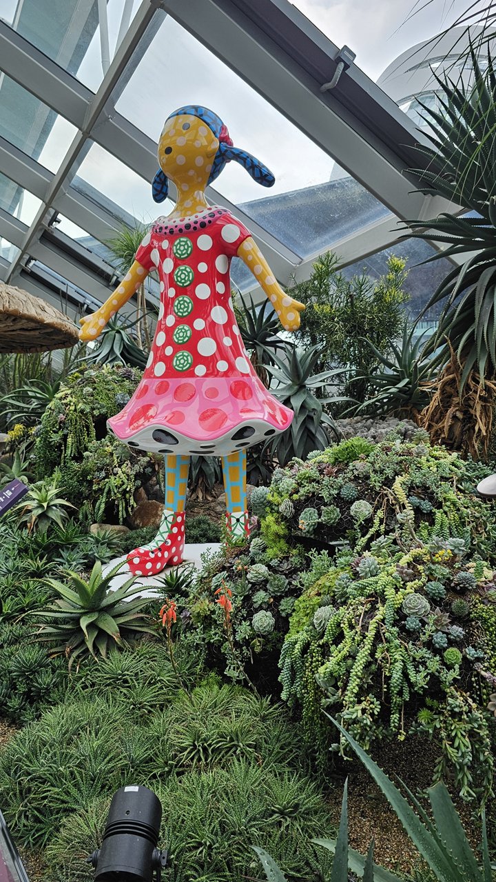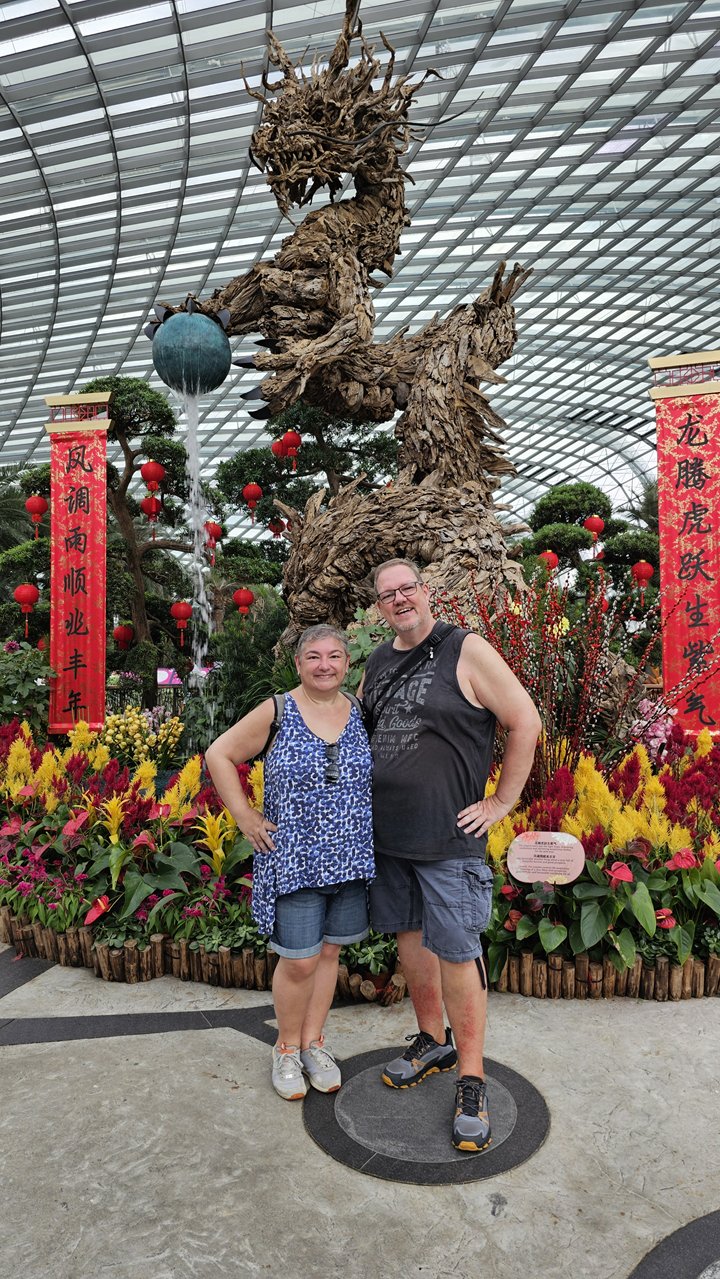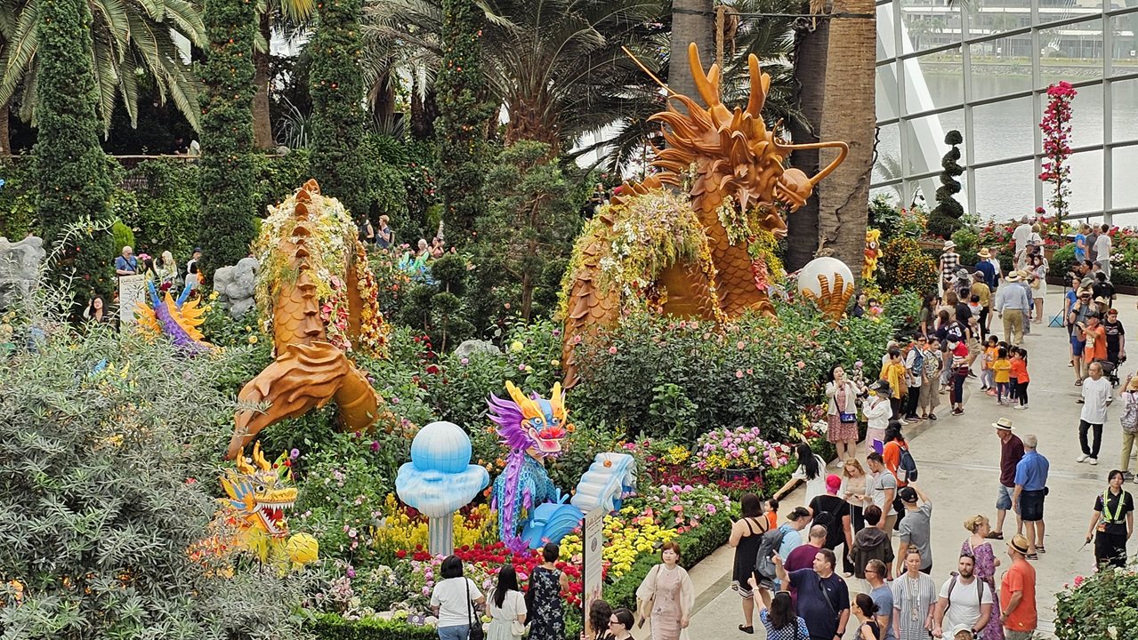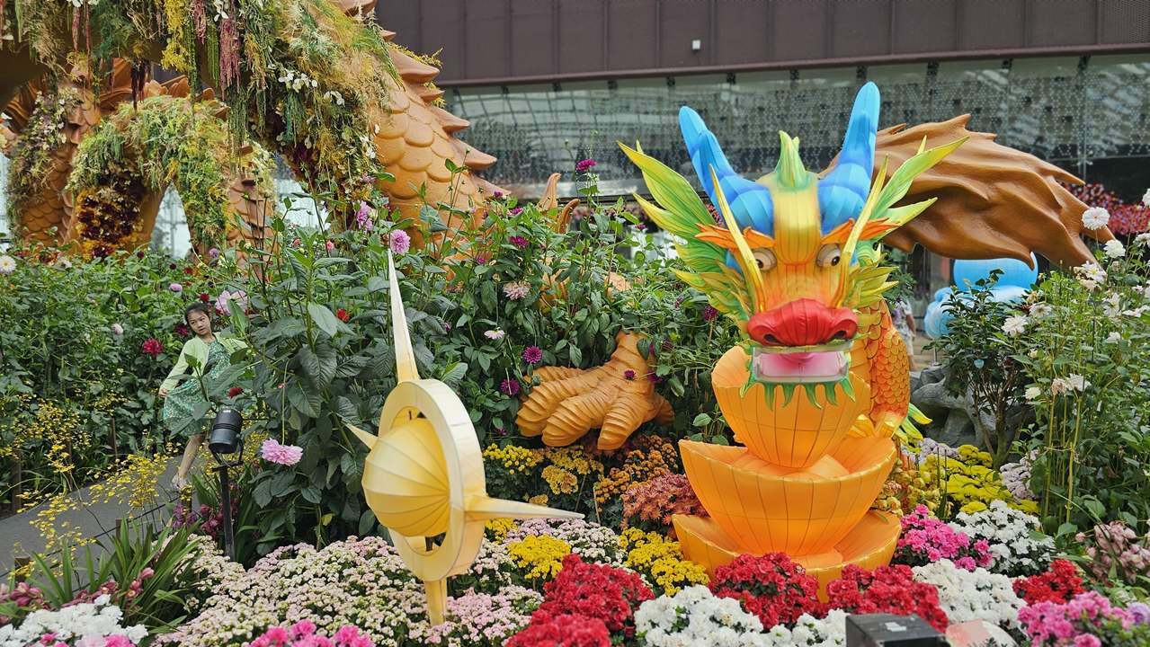 Die Blumen- und Pflanzenschau sowie die Dekoration wird einmal pro Quartal – je nach Jahreszeit – verändert. Daher sieht der Flower Dome immer etwas anders aus. Aktuell gibt es eine Sonderausstellung mit farbenprächtigen Dahlien: Dahlia Dreams 🌺. Und zusätzlich sind noch kunstvolle Drachen integriert, als Besonderheit zum chinesischen Neujahr des Drachen, das dieses Jahr zelebriert wurde.