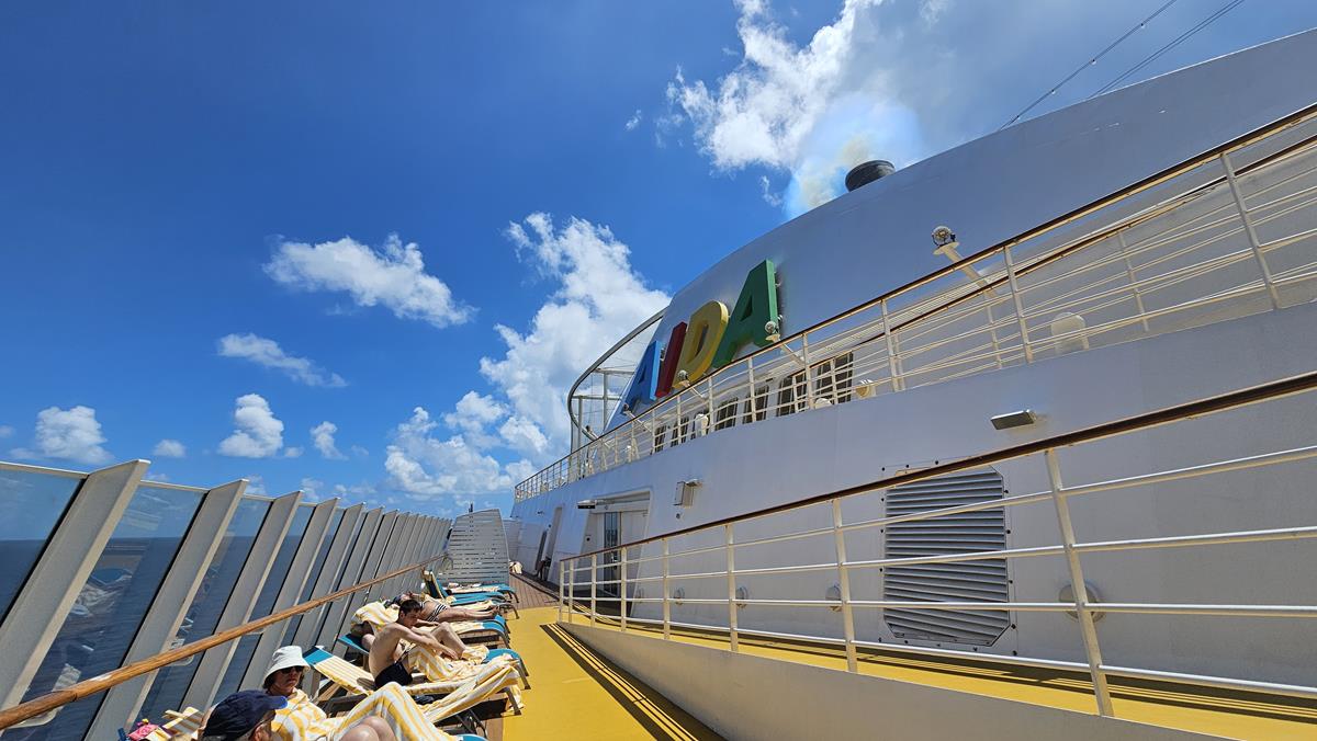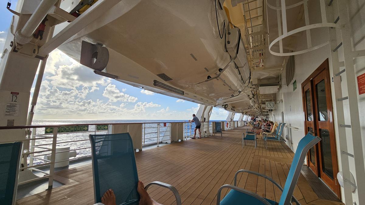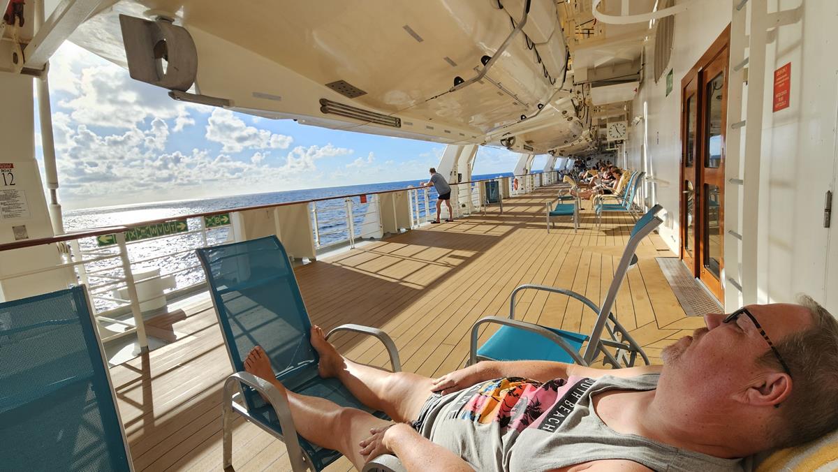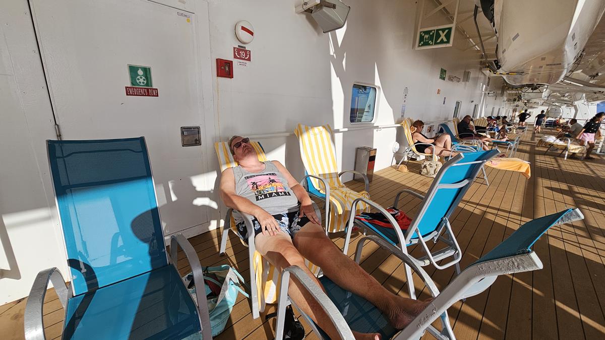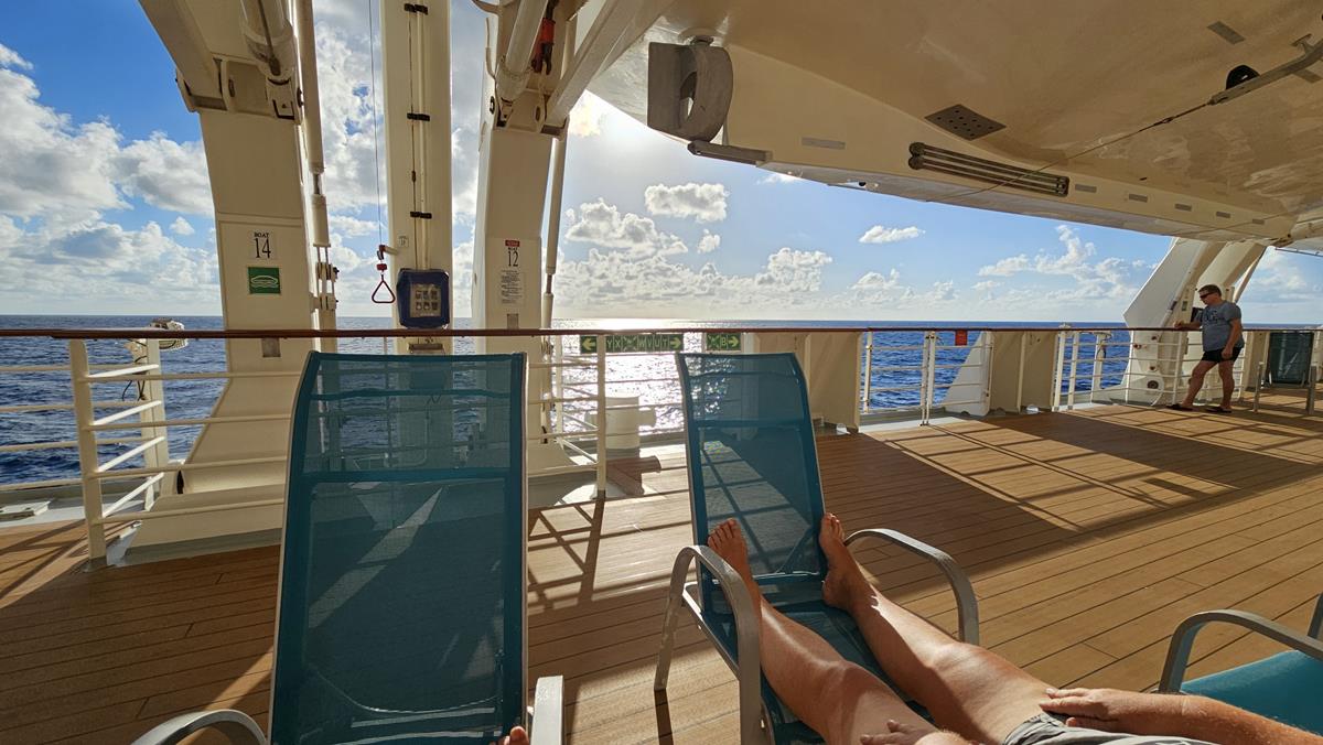 Irgendwann ist es uns auf dem Pooldeck einfach zu heiß und wir verziehen uns auf einen Schattenplatz auf Deck 5. Hier ist es schön ruhig und leer. Und unsere Haut freut sich, so ein Schattenplatz ist doch was Schönes 🙂