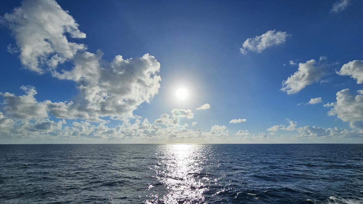 Langsam geht die Sonne unter. Wir beobachten den Sonnenuntergang von Deck 5 aus. Und zwar ganz gemütlich von unseren Liegestühlen aus.