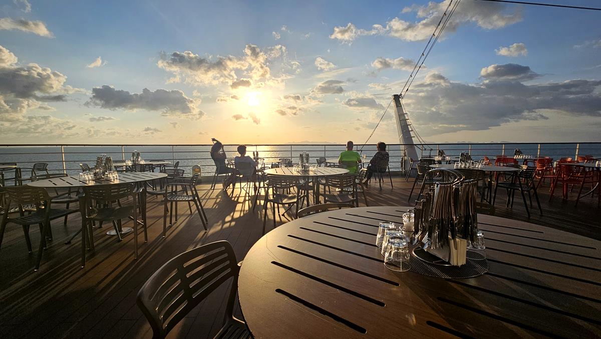 Erschöpft, aber glücklich lassen wir den Tag auf der Außenterrasse des Weite Welt Restaurants ausklingen, dort essen wir auch zu Abend. Und hier verfolgen wir natürlich die Abfahrt von AIDAbella um 19 Uhr.