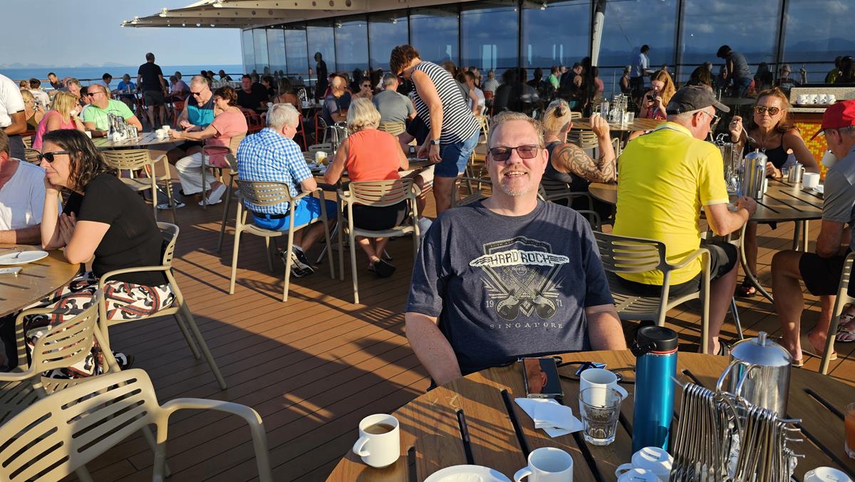 Schon um 7 Uhr suchen und finden wir einen Platz auf der Außenterrasse des Weite Welt-Restaurant zum Frühstücken. Am Horizont sieht man noch die Ausläufer des Sonnenaufgangs, die Sonne taucht alles in ein warmes Licht. Es verspricht ein schöner Tag zu werden.