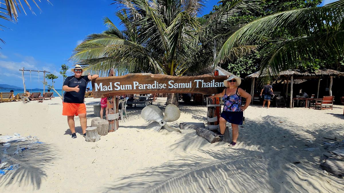 Wieder auf Ko Samui verabschieden wir uns herzlich von unseren Tourguides Marcel und seiner Frau. Beim letzten Stück, dem 15-minütigen Bustransfer zur Tender-Anlegestelle werden sie uns nicht begleiten. Die beiden waren wirklich top! Gerne wieder!