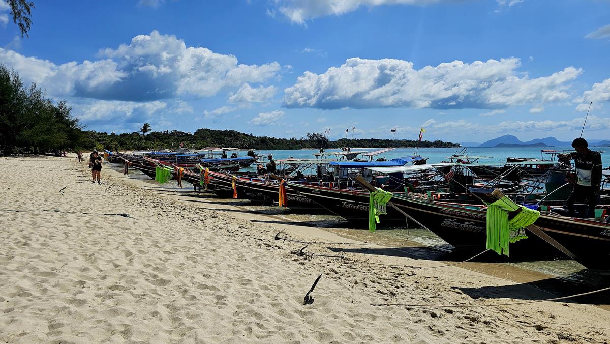 Unser Longtail-Boot fährt bis an den Strand und wir steigen im seichten Wasser aus. Somit werden wir auch von unten nass. Von oben sind wir es ja schon 😉