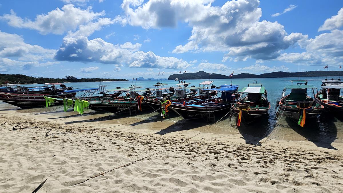 Der Bustransfer zum Longtail-Boot dauert rund 15 Minuten. Die traditionellen thailändischen Longtail-Boote sind schmale, bunt bemalte Langboote, rund 15 Meter lang und nicht breiter als 1,80 Meter. Insgesamt sind wir 14 Personen, eine schöne kleine Gruppe. Wir verteilen uns auf zwei dieser schmalen Boote, jeder bekommt eine Rettungsweste verpasst und los geht die wilde Fahrt!