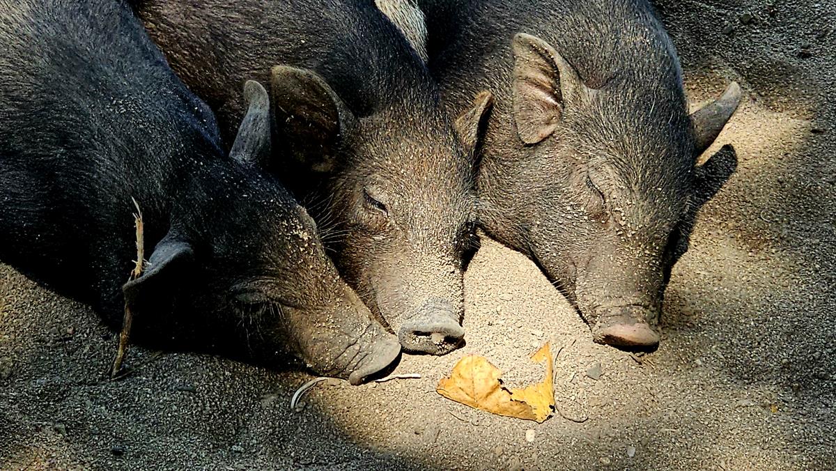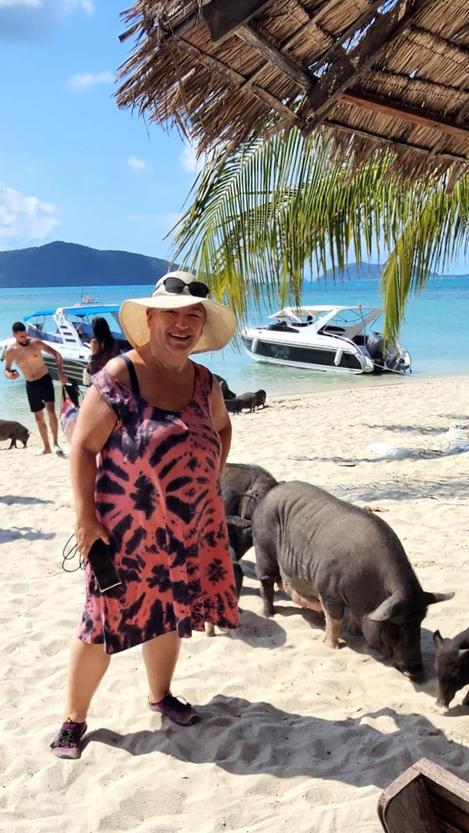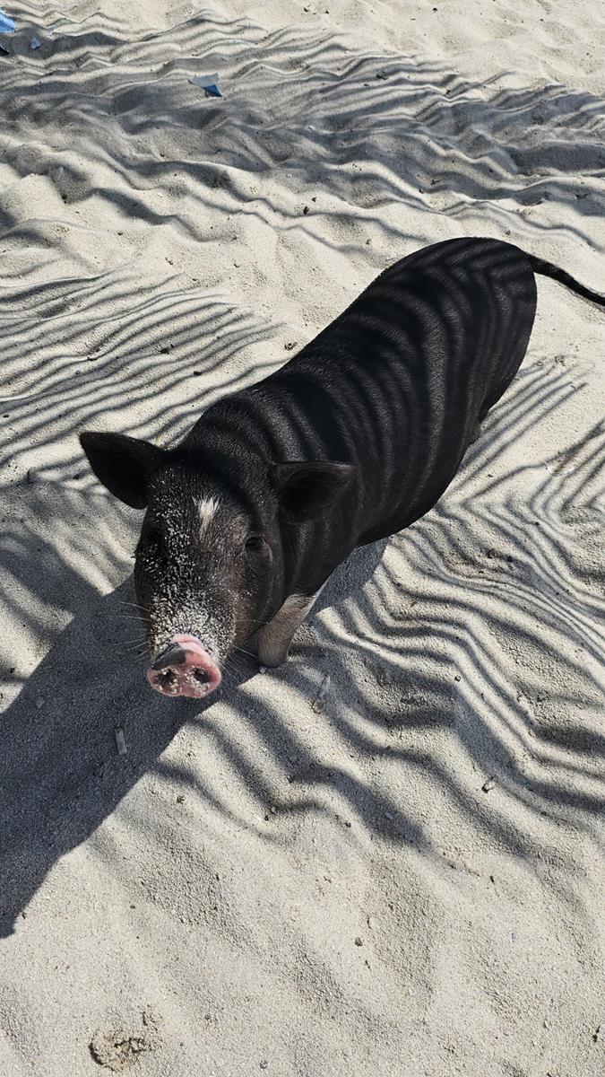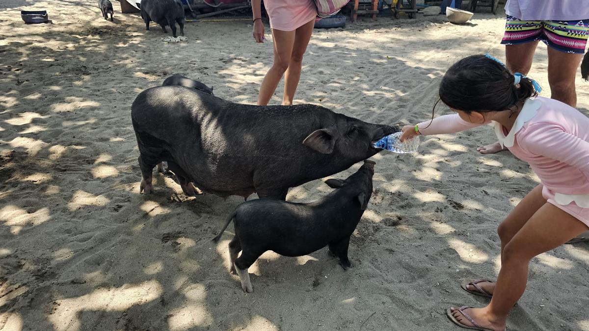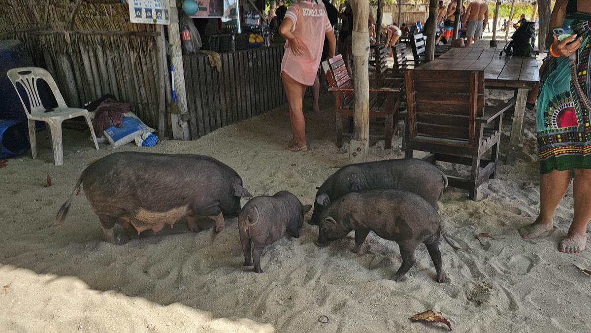 Die kleine Rotte von Schweinen ist hier wirklich die größte Attraktion. Sie lassen sich von den Gästen streicheln und füttern, sie gehen sogar mit ihnen am Strand baden. Sie scheinen das Wasser zu lieben und sind überraschend gute Schwimmer.