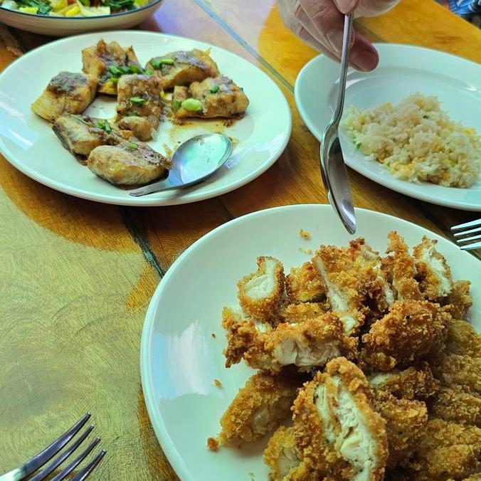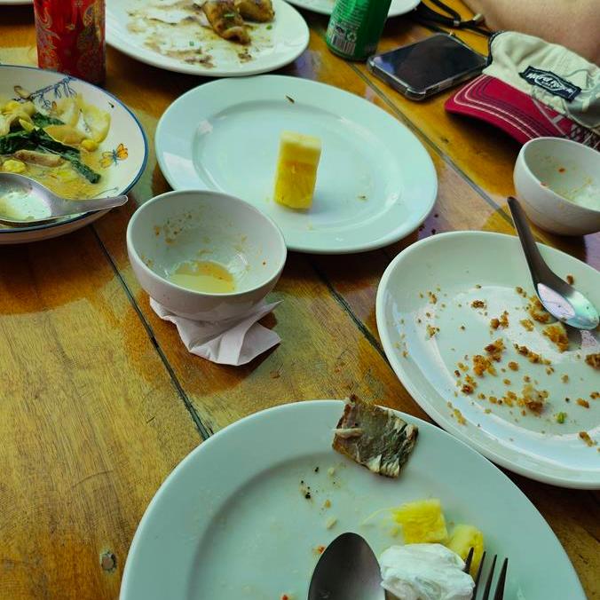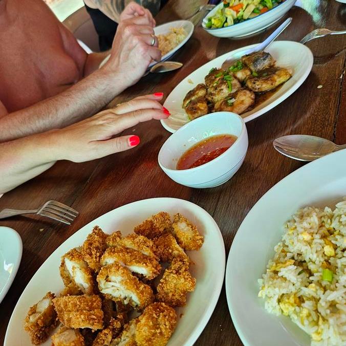 Es wird selbst gekochtes thailändisches Essen serviert, knusprig gebackenes Hähnchen und Fisch, gebratener Reis und Nudeln, verschiedene Salate und Saucen. Dazu gibt es alkoholfreie Getränke und frische Ananas. Die unterschiedlichen Speisen werden auf Tellern in der Mitte des Tisches aufgetischt. Jeder greift einfach zu und lässt es sich schmecken.