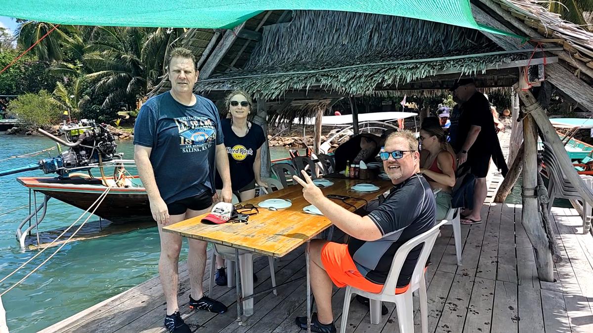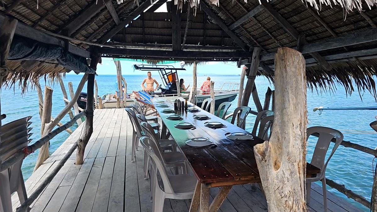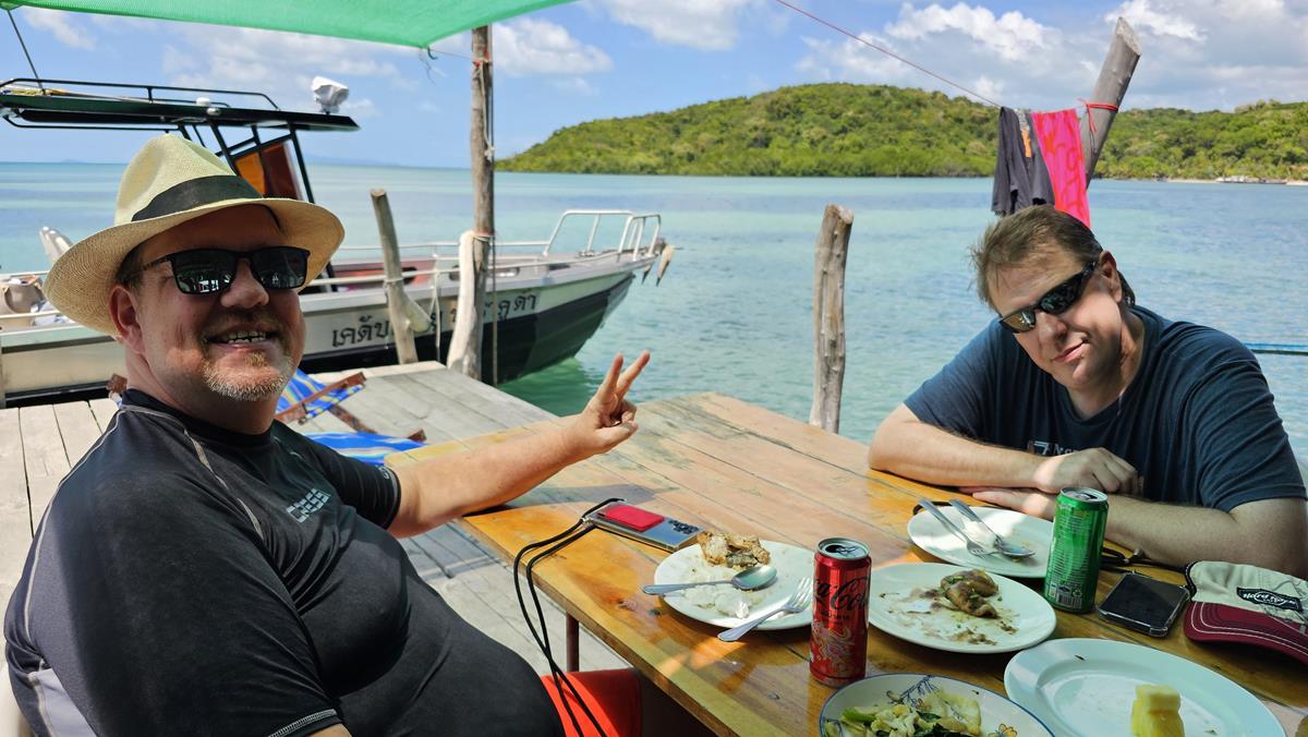 Auf dieser grünen Insel verbringen wir in einem dieser beiden Restaurants unsere Mittagspause, bei „Mr. Dam“. Es gibt lecker thailändisches Mittagessen, direkt am Wasser. Unser Tisch ist auf dem Anlegesteg vorbereitet, ein Strohdach schützt uns vor der Sonne. Mit gutem Appetit schlagen wir zu. Wir haben gar nicht gemerkt, dass wir Hunger haben!