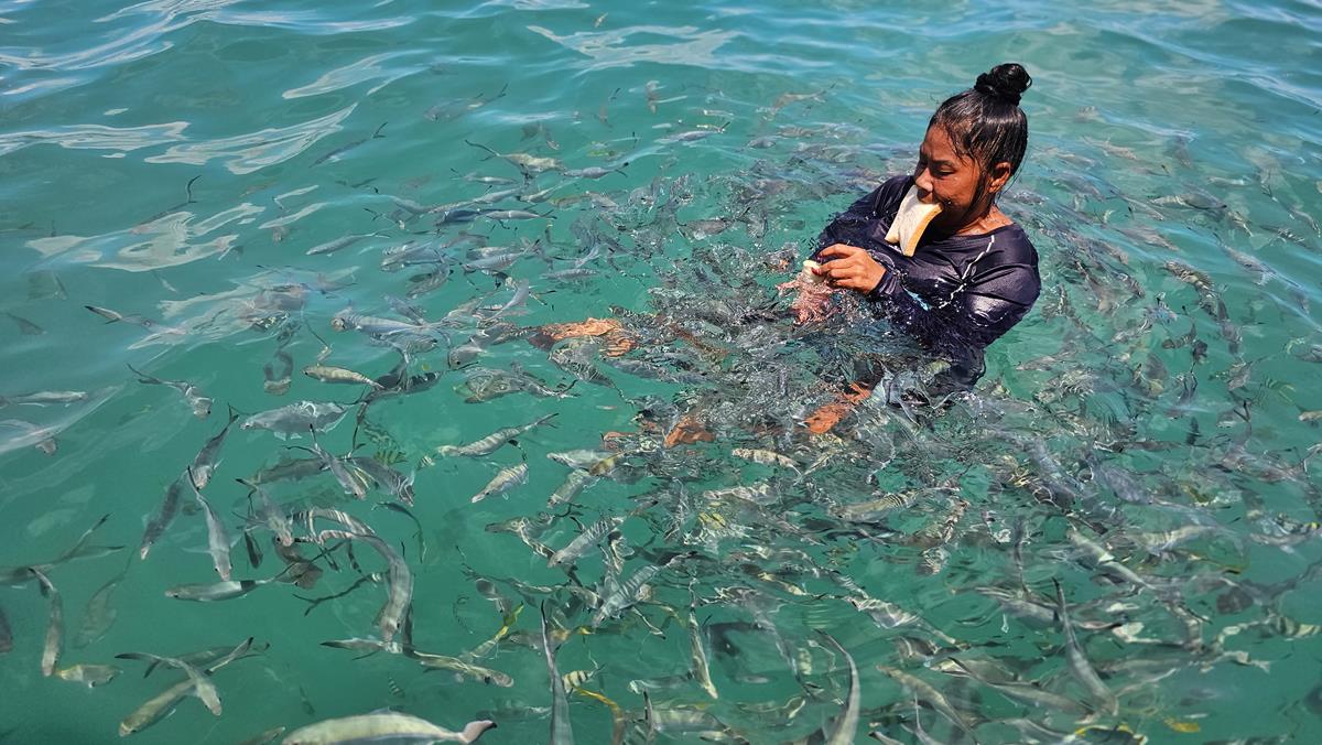 Unser zweiter Tourguide, die Frau von Marcel, macht es vor: Schwimmweste thailändisch angezogen und im Wasser die Fische angefüttert. Eine Vielzahl von Fischen schwimmt im kristallklaren Wasser um sie herum. Was für ein Gewusel 🙂