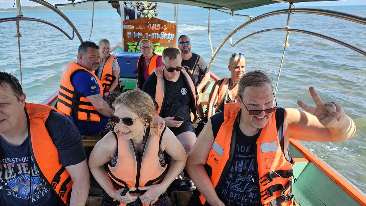 Der Mitarbeiter von Ken Samui ist schnell gefunden, er zeigt uns den Treffpunkt. Einfach über den kurzen Steg zu einem überdachten Meeting-Point laufen 🙂 Auch hier werden wir freundlich von Mitarbeitern von Ken Samui in Empfang genommen. Nur kurz warten und dann: Perfekt, es sind fast alle da. Nur zwei fehlen. Auf diese warten wir eine Weile, aber man kann ja nicht ewig warten. Und so entscheidet unser Tourguide Marcel, dass es ohne die beiden losgeht. Auf geht’s!