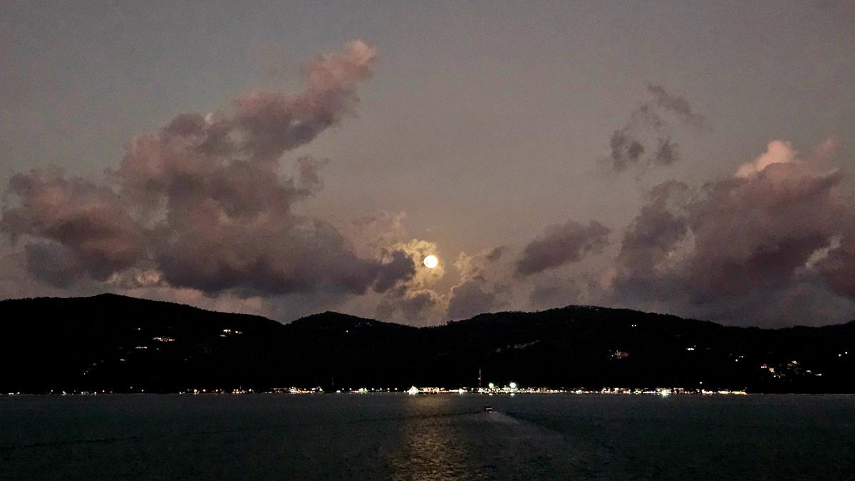 Und voll witzig: Kaum ist die Sonne untergegangen, geht ein grandioser Vollmond auf!