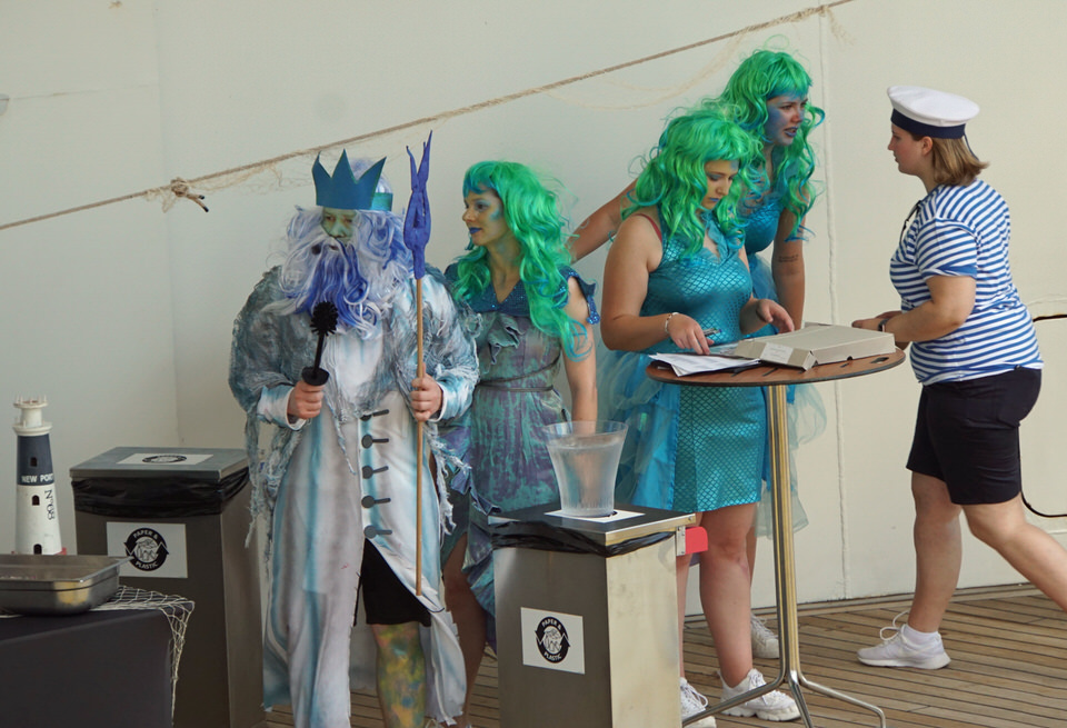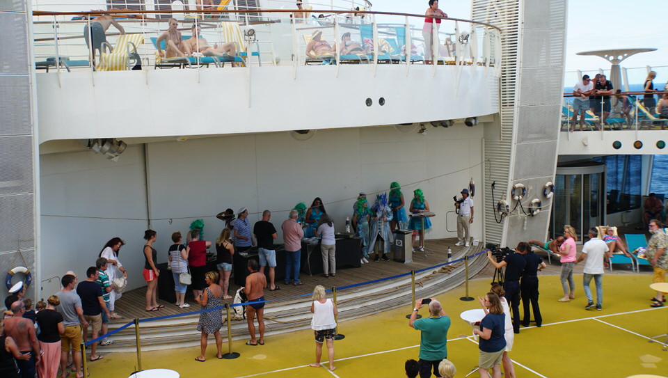 Ach ja, eine Besonderheit findet heute auf dem Pooldeck auf Deck 11 statt: Die Karibiktaufe. Alle die zur Taufe gehen müssen seltsame Sachen essen und trinken und werden dann von Neptun höchstpersönlich getauft und in sein Reich aufgenommen 🙂 Wir haben schon vor Jahren unsere Fischnamen von Neptun erhalten. Daher lassen wir heute die Taufe links liegen und amüsieren uns über die Taufen der anderen Gäste 🙂