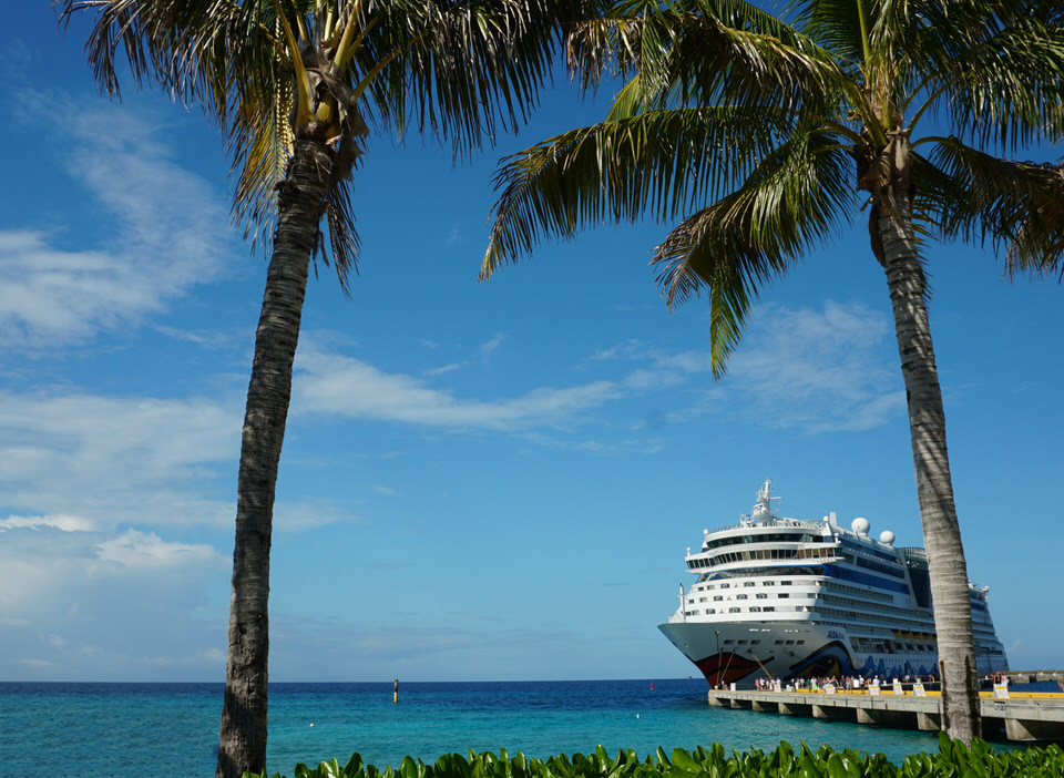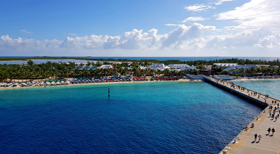 Es kรถnnen maximal zwei Kreuzfahrtschiffe gleichzeitig anlegen. รber den langen Pier gelangt man direkt in das Cruise Center mit Geschรคften, Bars und Restaurants. Und neben dem tollen Strand, den wir schon vom Schiff aus gesehen haben, gib es eine riesige Poollandschaft. Die Liegestรผhle und Sonnenschirme sind sogar kostenlos. Den wollen wir uns spรคter noch anschauen ๐
