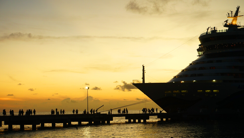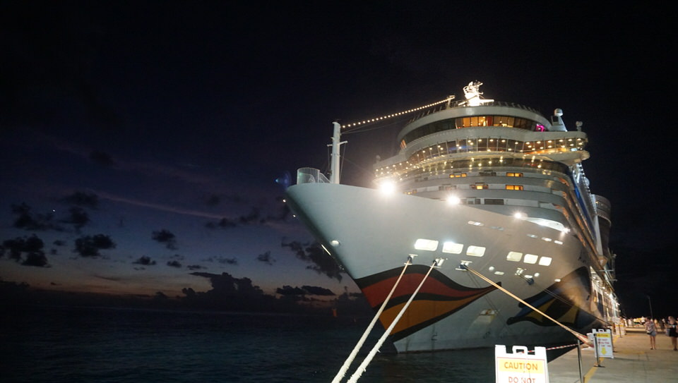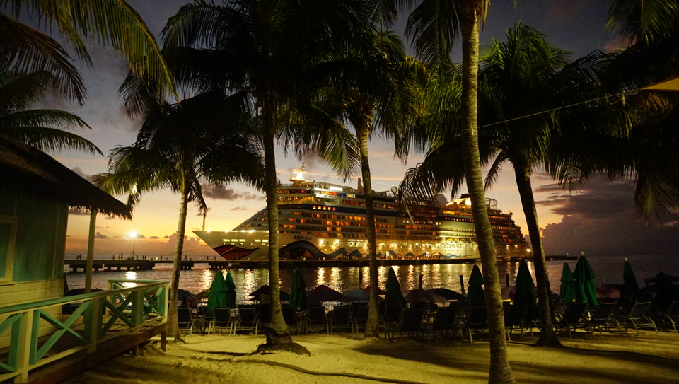Selbst das bekannte Lokal Margaritaville macht um 18:00 Uhr zu. Wir liegen allerdings bis 22:00 Uhr vor Anker. Wir nehmen nach dem Bad im Pool noch einen Sundowner im Margaritavile und sitzen mit schรถnsten Blick auf unsere Diva in vorderster Reihe.
