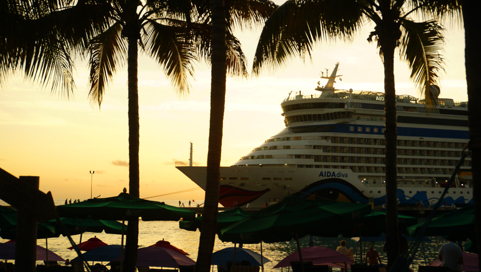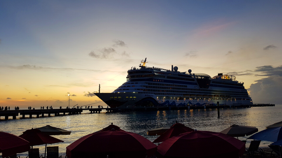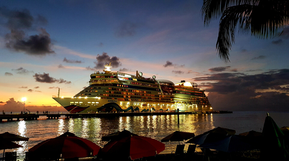 Von unserem Platz im Margaritaville haben wir einen genialen Blick auf AIDAdiva. Langsam geht die Sonne dahinter unter. Ein schรถnes Bild!