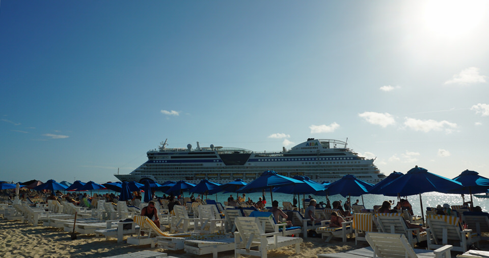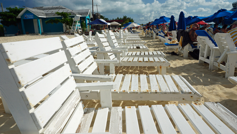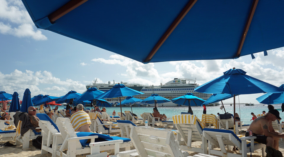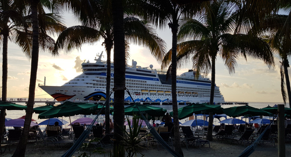 Viel zu schnell brechen wir wieder auf und fahren zurรผck. Die Crew lรคsst uns an einem Strandabschnitt mit dem firmeneigenen Bar & Grill Restaurant unweit der AIDA aussteigen. Fรผr uns sind die Liegen und die Schirme kostenfrei. Andere Gรคste zahlen 15 US$ fรผr zwei Liegen mit Auflagen und Schirm.