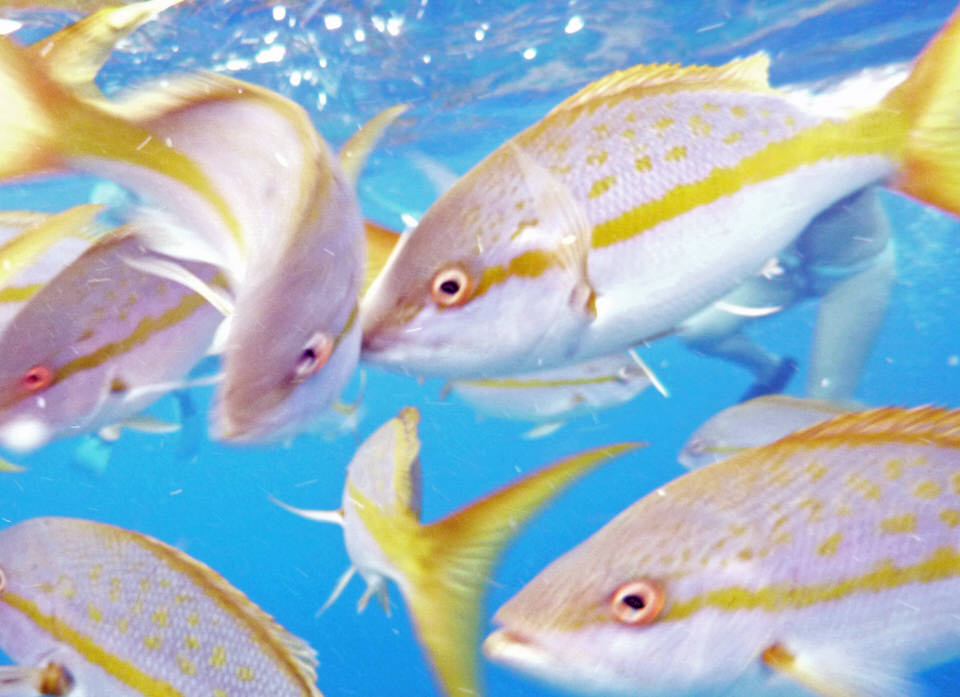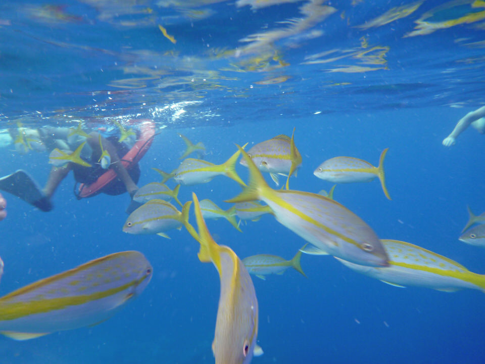 Es sind die ganze Zeit drei Guides mit uns im Wasser. Die Fische mรผssen zwar angelockt werden, sind dann aber in Scharen da. Ein Fisch beiรt Astrid in den Finger – vorwitziges Ding!