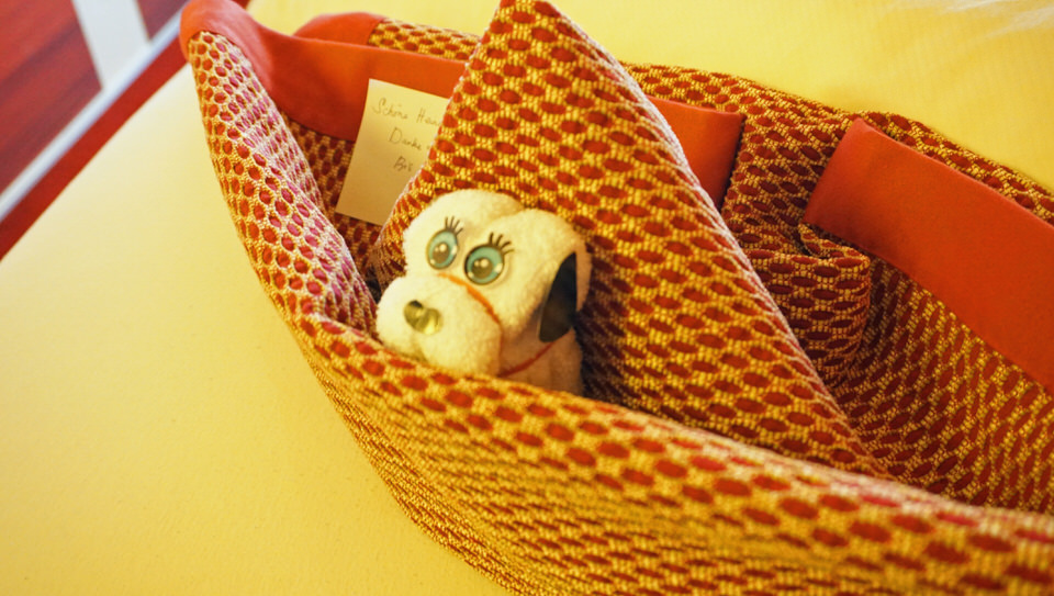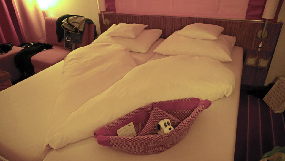 Und dann finden wir eine schöne Überraschung in der Kabine vor: Ein Herz aus der Bettdecke gefaltet und ein kleiner Handtuch-Hund 🙂 Da hat unsere Kabinen-Fee ja was Schönes gezaubert 🙂 Danke!
