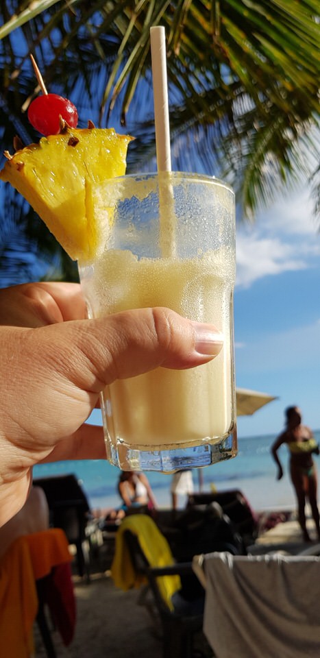 Klärt sich alles auf. Wir sitzen sehr lauschig unter Palmen und bekommen nach karibischen 15 Minuten unseren Willkommensdrink. Wahlweise Pina Colada oder Mojito. Wir entscheiden uns für die Pina Colada. Die richtige Wahl, lecker!