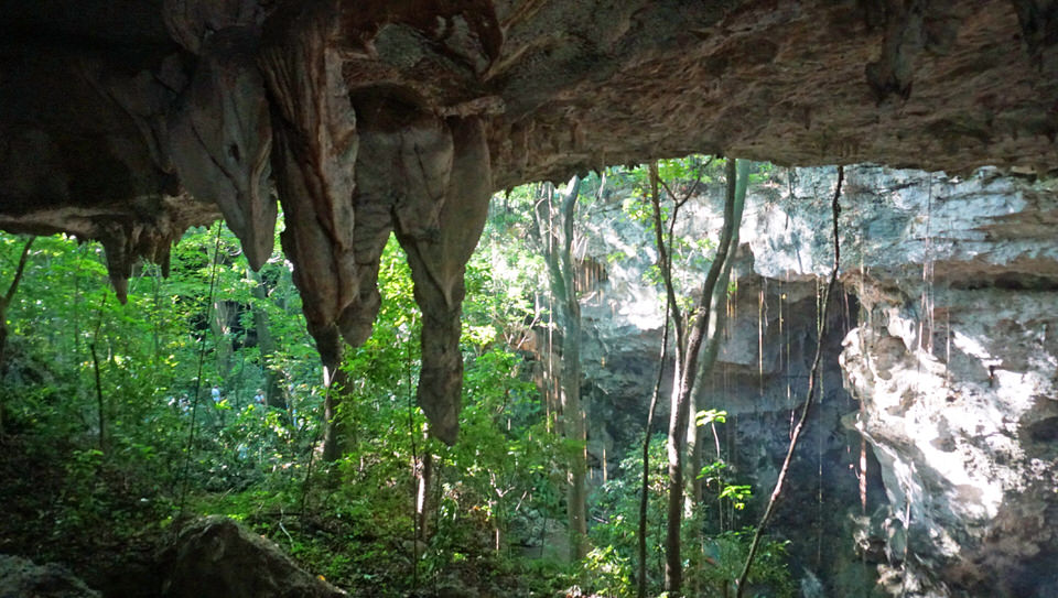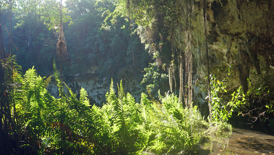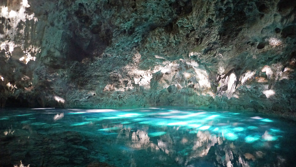 Stalagmiten, Stalaktiten und drei schillernd blaue Süßwasserlagunen oder „Augen“, wie sie die Ureinwohner wegen ihrer ovalen Formen nannten, bilden einen ganz eigenen Kosmos. Hinzu kommt eine immens hohe Luftfeuchtigkeit und es geht kein Hauch von Wind. Im Nu sind wir alle ziemlich verschwitzt.