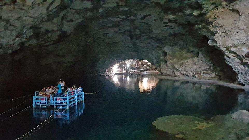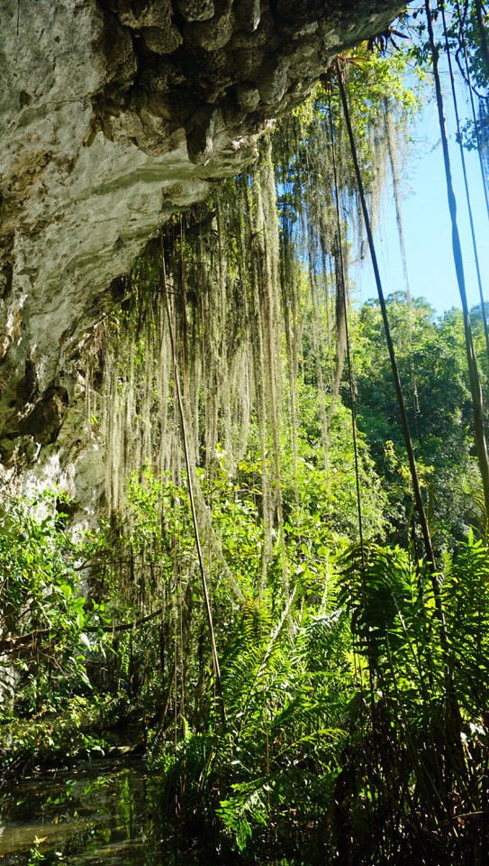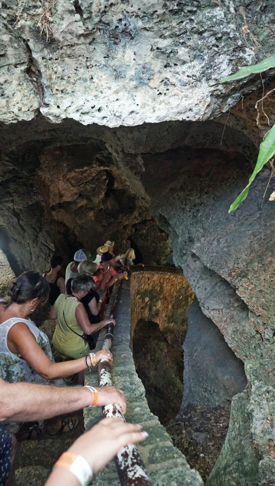 Die Floßfahrt dauert nur 3 Minuten und ist ein echtes Erlebnis. In einem Floß aus Holzbrettern, die auf leeren Fässern befestigt sind, werden wir an Seilen mit Manneskraft über den See gezogen. Und erreichen auf der anderen Seite eine weitere Höhle. Diesmal mit „offenem Dach“ und ganz viel Vegetation. Super schön hier!