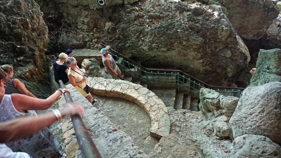 Kurz hinter der Kasse ist der Eingang in die Grottenlandschaft. Über eine gewundene Treppe steigen wir 50 Stufen hinab und sind plötzlich in einer anderen Welt.